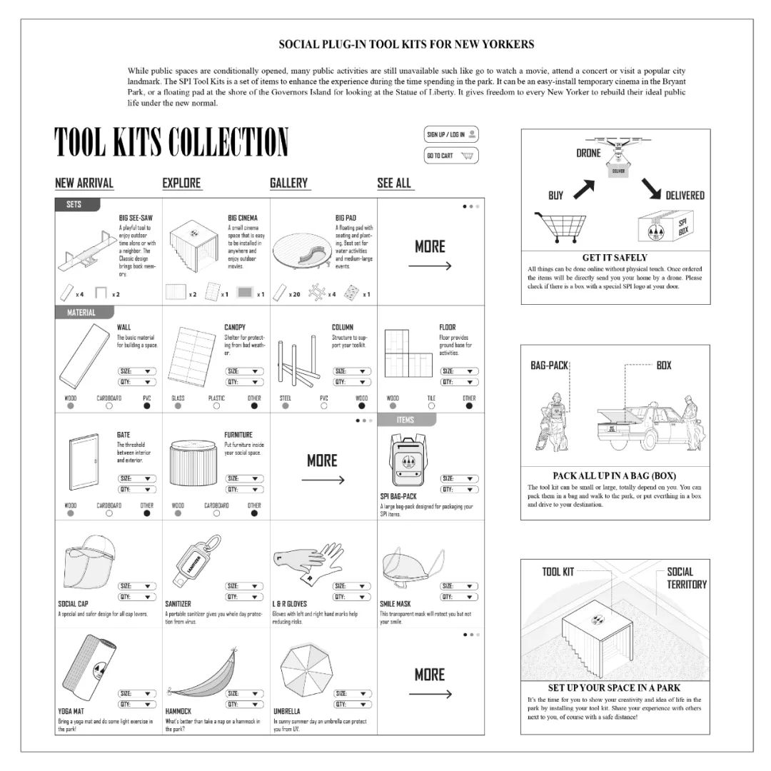 第三个关键词,是微介入(micro intervention)。尽管基于城市尺度的设计提案往往是宏观的,但介入的方式却可以从小处入手。这与我景观设计的学习与实践背景有关——景观总是从各种尺度与世界产生关系,从私人庭院到地域规划,从街头绿地到全球生态系统。因此,我总是希望突破尺度的限制,从微小的角度找到解决大问题的方向。第三个作品是去年在新冠肆虐最严重之际做的,探讨的是作为当时疫情最严重的纽约如何处理社交距离与公共空间的问题。在全球抗疫的背景下,公共空间成为了牺牲者:原本受到大众欢迎的相聚场所,因为病毒的高传播性而成为了人人避而远之的问题之地。然而随着时间推移,人们逐渐发现,病毒有可能长期存在,“后疫情”时代是一个长期且复杂的人与病毒抗争且共存的阶段,公共空间不可能永远关闭。因此,我们尝试提出一套小插件计划,让每个使用者携带着“社交插件”来到公共空间中,开展既保障安全,又能享受户外环境的活动。