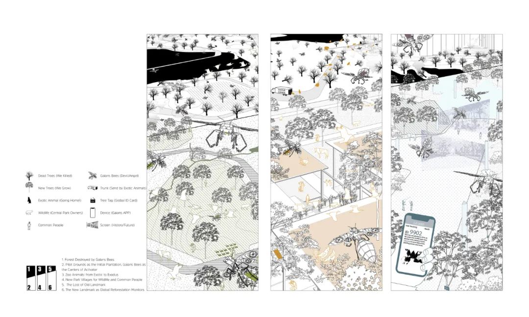 在ICONOCLAST的竞赛作品中,纽约中央公园被生态恐怖主义者(eco-terrorist)夷为平地以控诉曼哈顿的绿地都为富人服务。这是竞赛一个官方设定的背景,以此邀请全球设计师一起思考如何重建毁灭后的中央公园。在很多提交作品,包括获奖作品中,我看到了对公园未来美好的想象,对具体场景巧妙的设置,大有让中央公园比以往更加宏伟、壮丽和夺人眼球之势——但关于恐怖主义者这一设定,却少有被提及。在这里,我认为设计师的天真起到了反作用:如果天真地忽略毁灭者当时的动机和诉求,一味投入到设计的趣味而专注于对中央公园的更新提升,甚至让其标志性更突出,难道不会引来第二次的袭击吗?因此,在这个作品中,我们提出了另一个思考角度,即幻想自己就是生态恐怖主义者的头目投稿竞赛,逆向思考中央公园存在已久的社会和环境争议,从而提出设计的方案。我们认为,重建一个美丽的中央公园是次要的甚至是无关紧要的,更重要的是全球环境破坏问题如何被解决,以及新的中央公园在其中可以扮演怎样的角色。