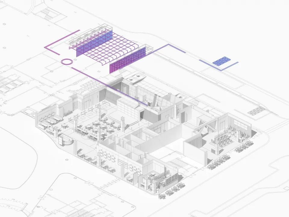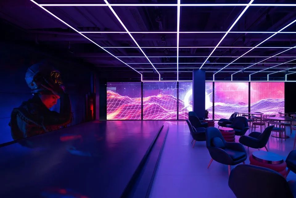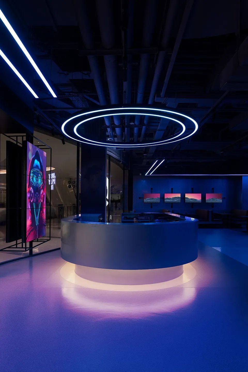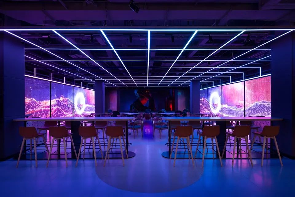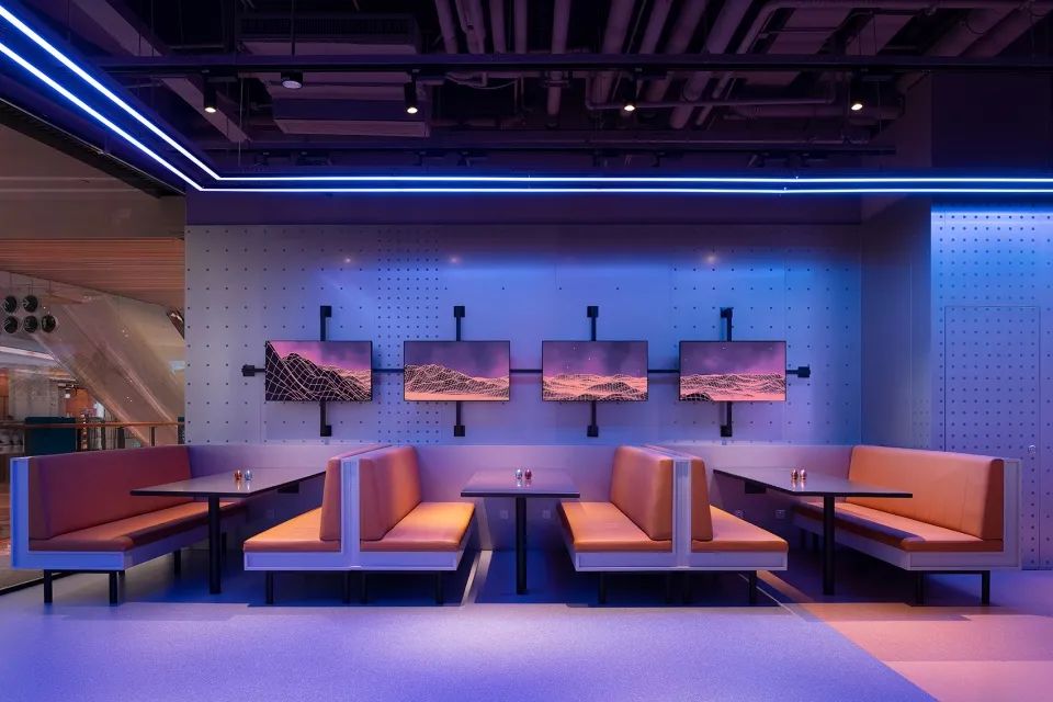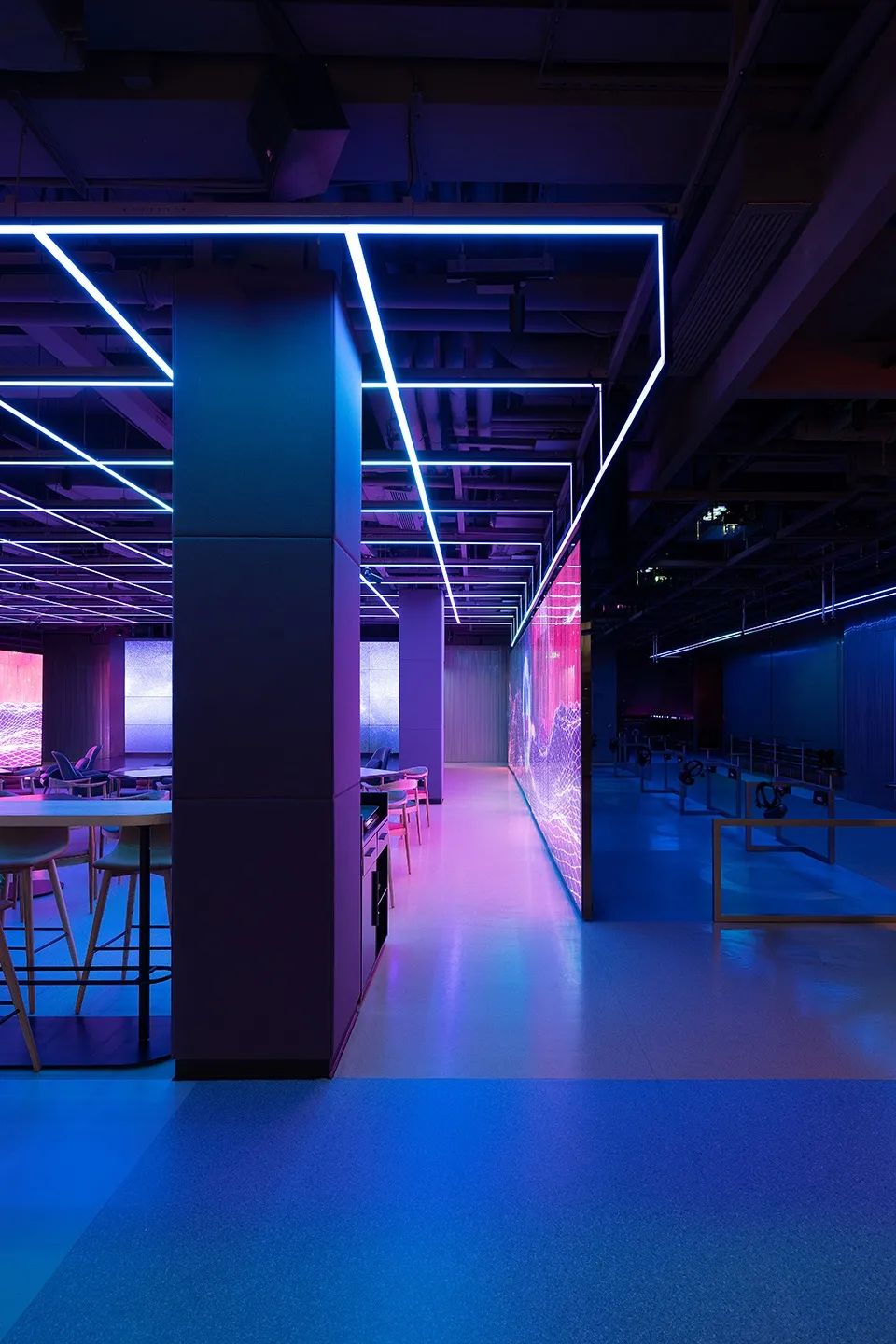 天花上一系列LED灯条贯穿整个空间,舞动的彩色灯光在空间里为顾客提供指引。这些灯条在主舞台区构成一个具有冲击力的网格结构,让这个区域成为不可忽视的视觉焦点。舞台区的设置可举办各种不同活动:从表演到现场电玩竞赛赛事;从瑜伽课到编程工作坊。大型LED墙和舒适的座位区与舞台结合,让不同的社群可以在此聚会并相遇。