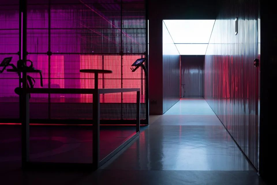 走入易星球迎宾区,穿孔与波浪铝板不断反射来自LED墙面的光芒与色彩,引发一种数字与实体交错、超然于世的情绪。透明的可折叠LED屏幕墙环绕着主舞台,让不同区域中的顾客视线无阻,连结各个活动中的玩家与观众。地面由不同暖色调的PVC色块组合,灯光照明下区分不同区域,并做为视觉导引。