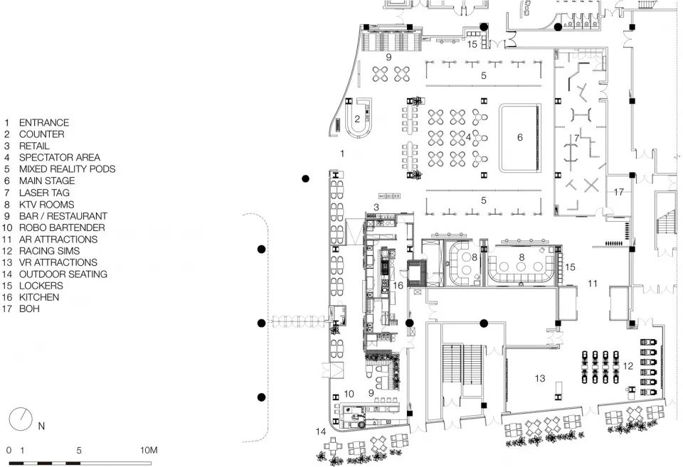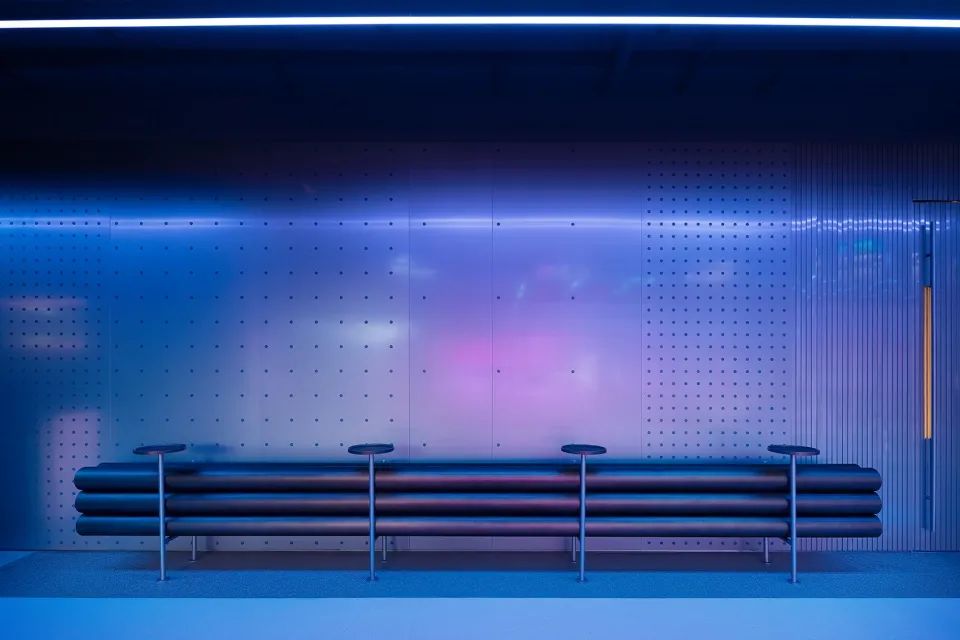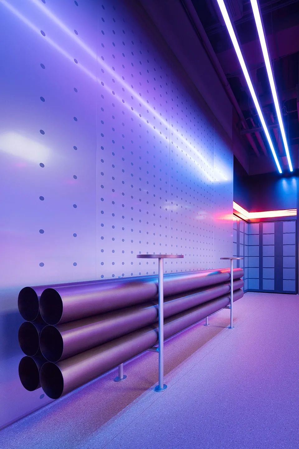 除了提供最前沿的设施,餐饮区还有一个“机器人酒吧”,完美演绎这个高科技游乐场的场景。一排设置在吧台上方、吸人眼球的两条线性型灯一亮,更是提升了整体未来感的氛围。