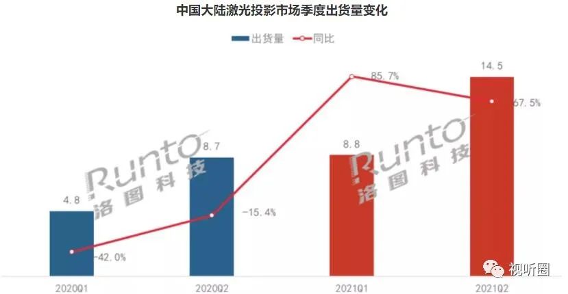 而到2021年,激光显示技术更是进入另外一个全新的节点。根据洛图科技(RUNTO)发布的《中国大陆激光投影市场季度分析报告》显示,2021年上半年,中国大陆激光投影市场出货量为23.4万台,全年有望突破60万台。相对于消费级电视和商用级平板,激光显示正在成为产业和资本关注的技术赛道。