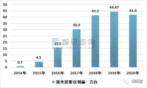之后在销量规模也开始不断翻倍增长,到2017年整个市场销量规模已达到44万台左右,而2014~2019整个激光投影市场的复合增速为129%。