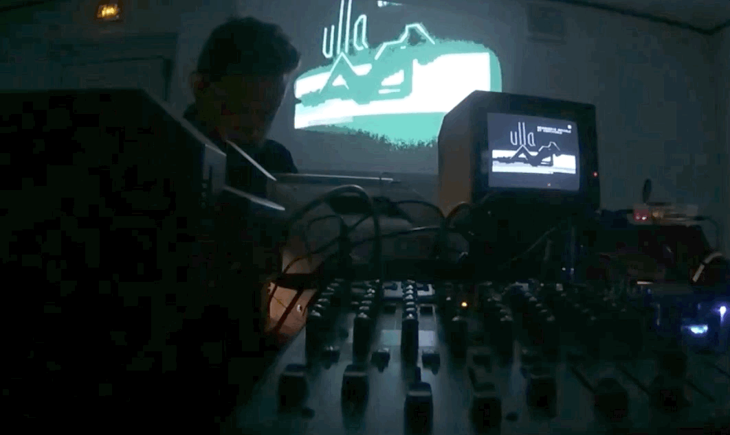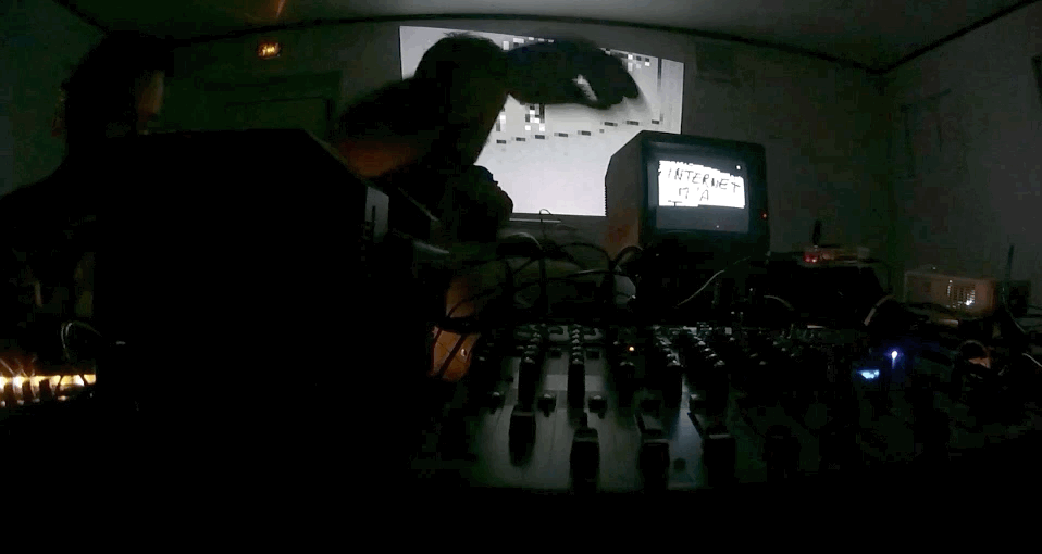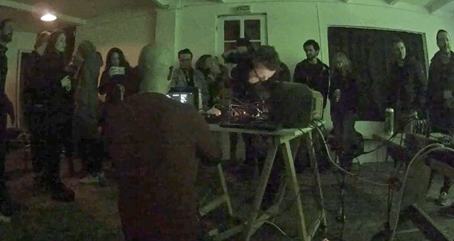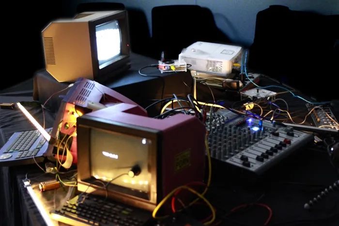 在现场表演的昏暗房间里,一批人聚集在一起,感受 Minitel 产生的声音和视觉,像是一场复古派对。