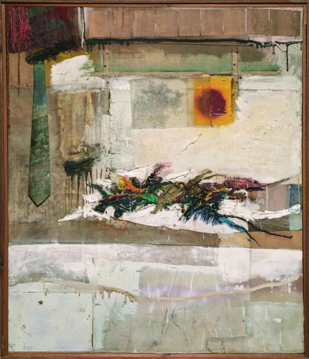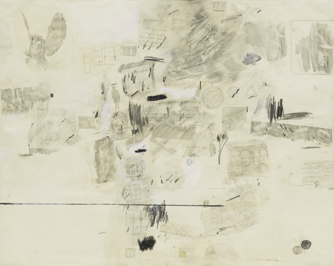 罗伯特·劳森伯格(Robert Rauschenberg)《Rhyme》,122.6×104.4cm,1956年