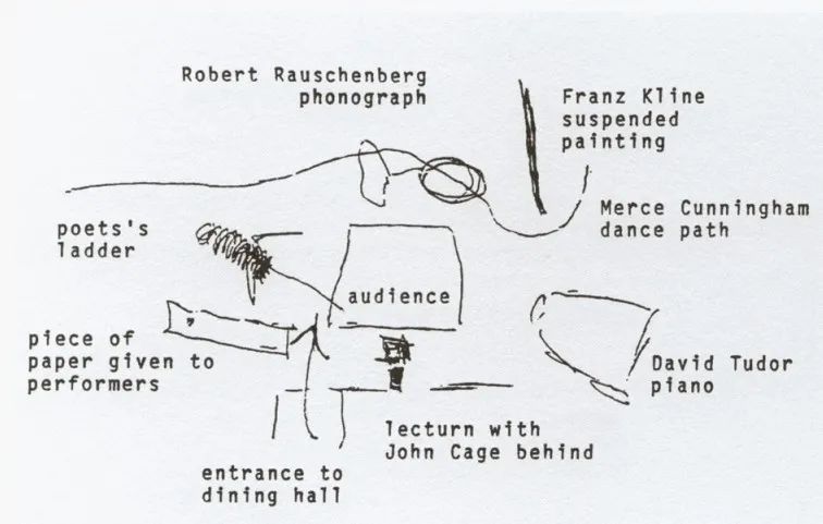 但凯奇并不满足于此。1952年,他先是在黑山学院完成了《4分33秒》;而后,他筹划的《剧场作品一号》在学院食堂的午餐时间上演。这是一个涵盖音乐、舞蹈、诗歌和绘画等艺术形式的表演,所有参与者皆临场发挥,未经过任何编排。