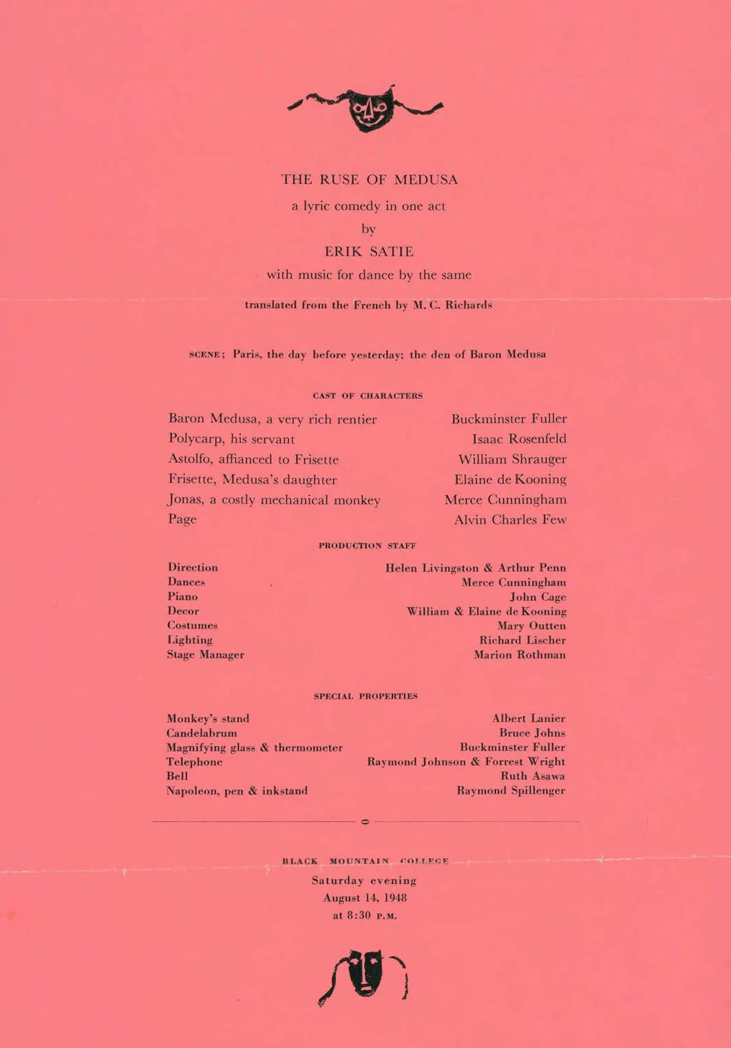 黑山学院的戏剧之路始于1948年的夏天。彼时,作曲家约翰·凯奇(John Cage)在黑山学院驻留并组织了一系列埃里克·萨蒂(Erik Satie)作品的音乐会。该系列的最后一部作品是萨蒂的超现实喜剧《美杜莎的诡计》。