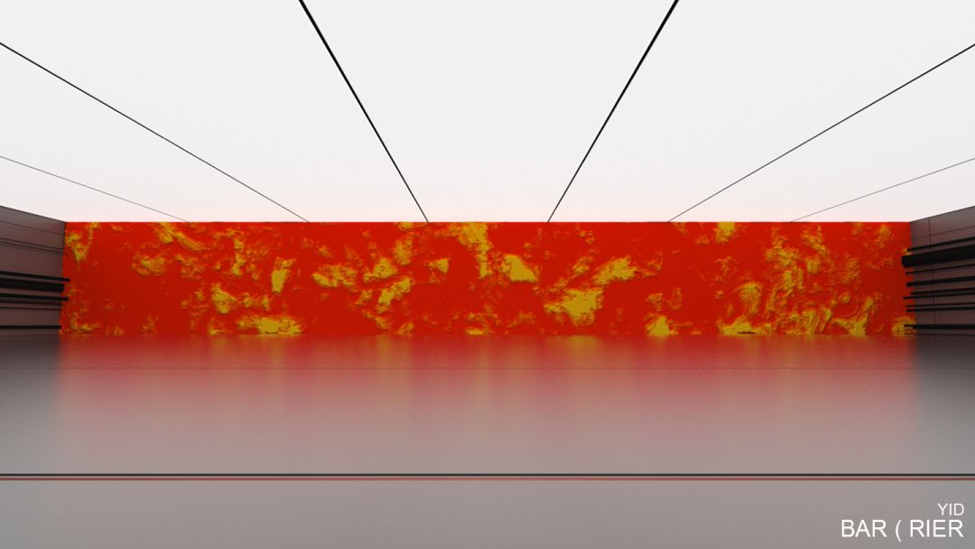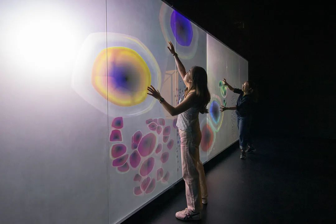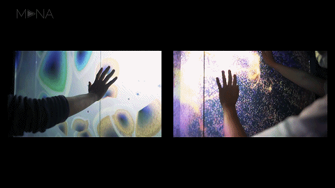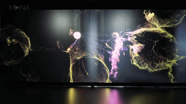 沿袭《死亡搁浅》中的时空分裂,跨空间和跨时间的合作为核心概念,WALL使用两个巨大的投影玻璃墙将空间分隔为两部分。一面是代表宇宙大尺度的粒子空间,一面则是代表生物小尺度的细胞层。一侧的观众不能够直接和对面的观众互动,但是他们的身型将会被传感器捕捉并且在另一面以粉色的异世界粒子或者小型的细胞显示出来。观众则可以直接通过触摸和自己一侧的元素进行互动。