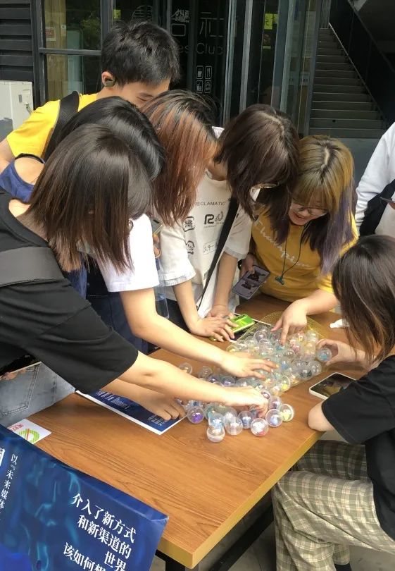 图:四川美术学院“FMAA 学院奖志愿者们”在毕业展期间向师生组织学院奖征集投稿作品的场景。