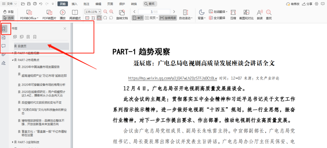 阅读中如想返回顶部目录页,点击阅读页面左侧“书签”按钮中的“目录页”即可(操作如下图所示)。