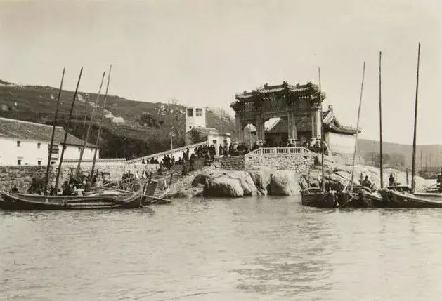 当时的舟山定海县风光,唐朝始设翁山县,清康熙年间的公元1688年设为定海县,图中建筑沿岛而建,大多是深宅大院,码头上停泊着汽轮和大小民船,迎面的墙上是整幅的英美烟草公司所产的“红锡包”香烟广告。