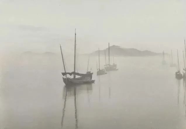 渔港中,晓雾朦胧,几艘渔舟,静静地停泊,根根桅杆,远处的山岛,如浮在空中,山形如舟,也许这就是舟山得名之缘由。