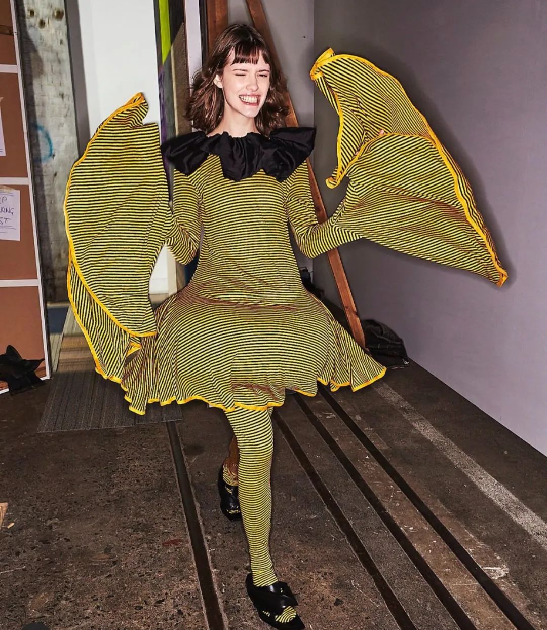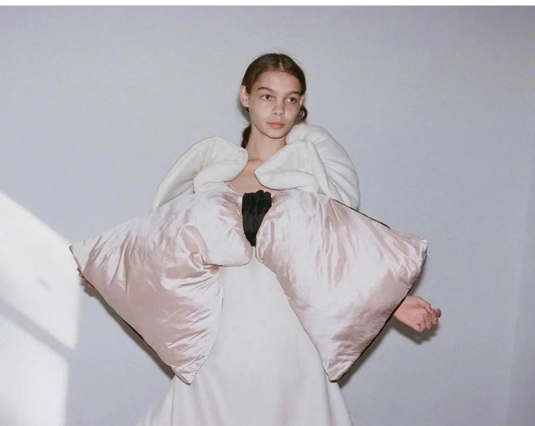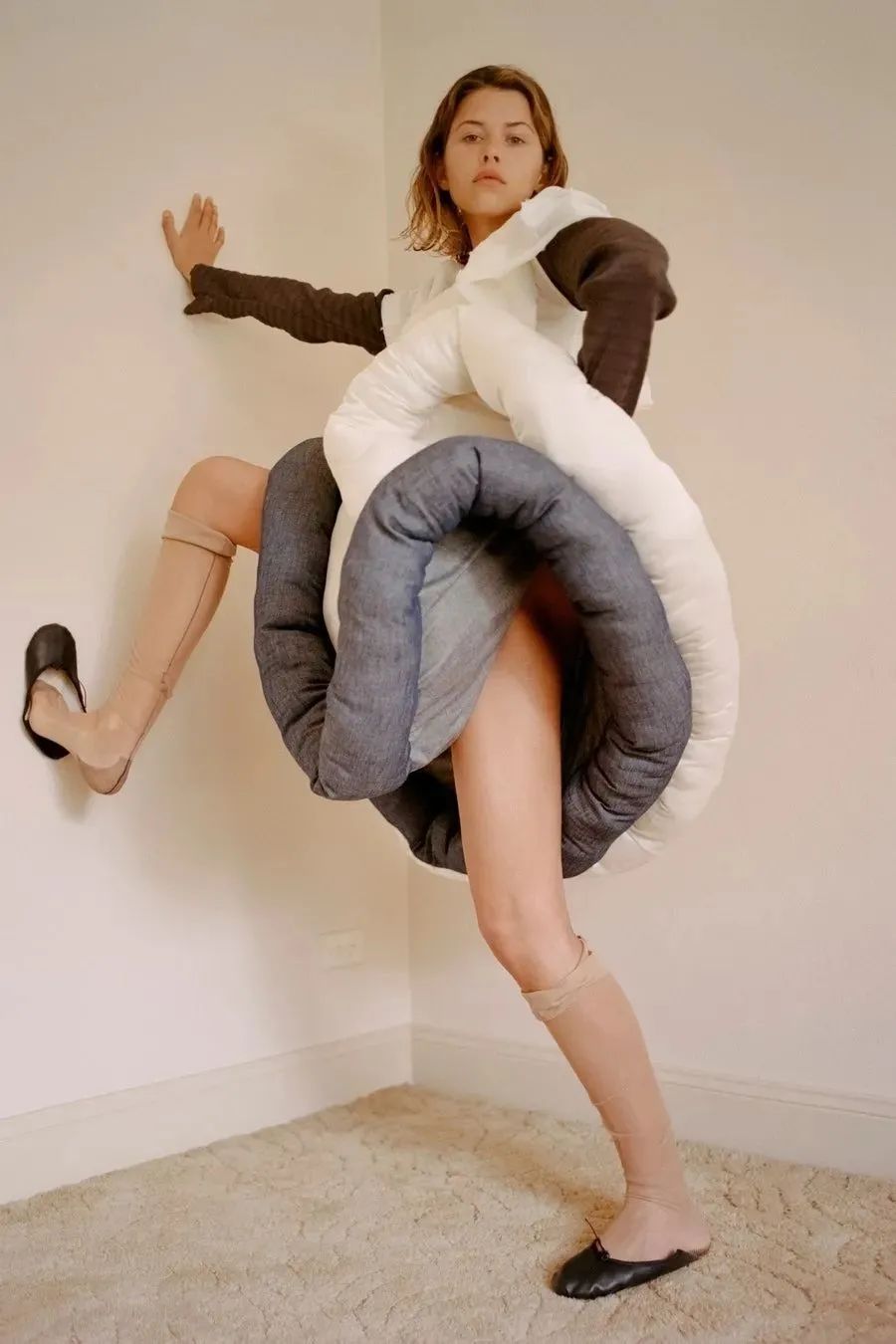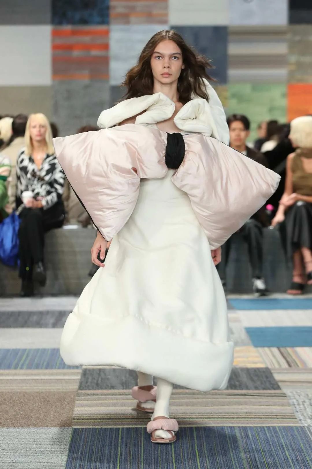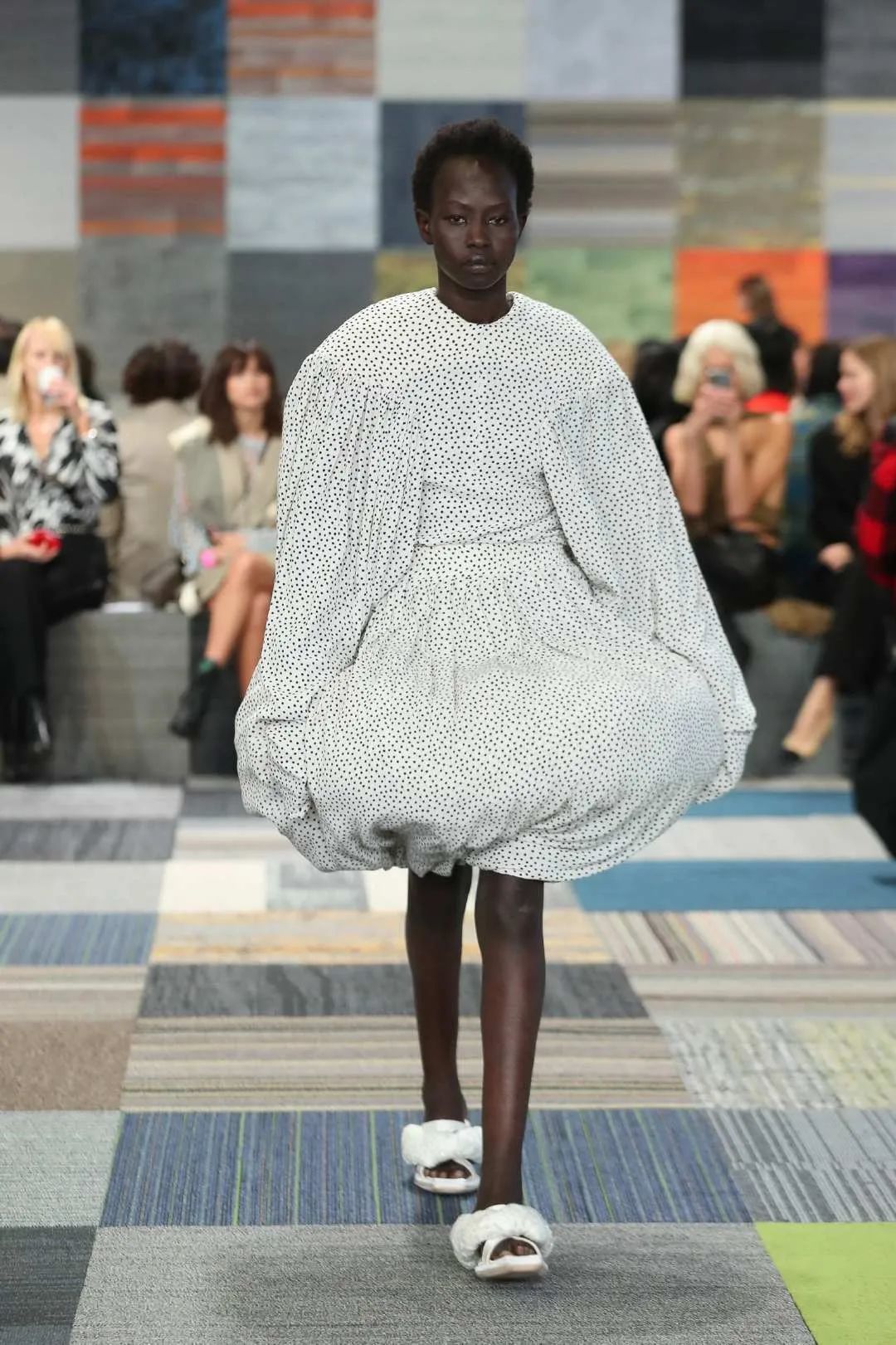 夸张的大袖子仿佛枕头,配色柔和的格纹仿佛床单,Jordan Dalah好像把家拆开了,为人们营造出舒适感。