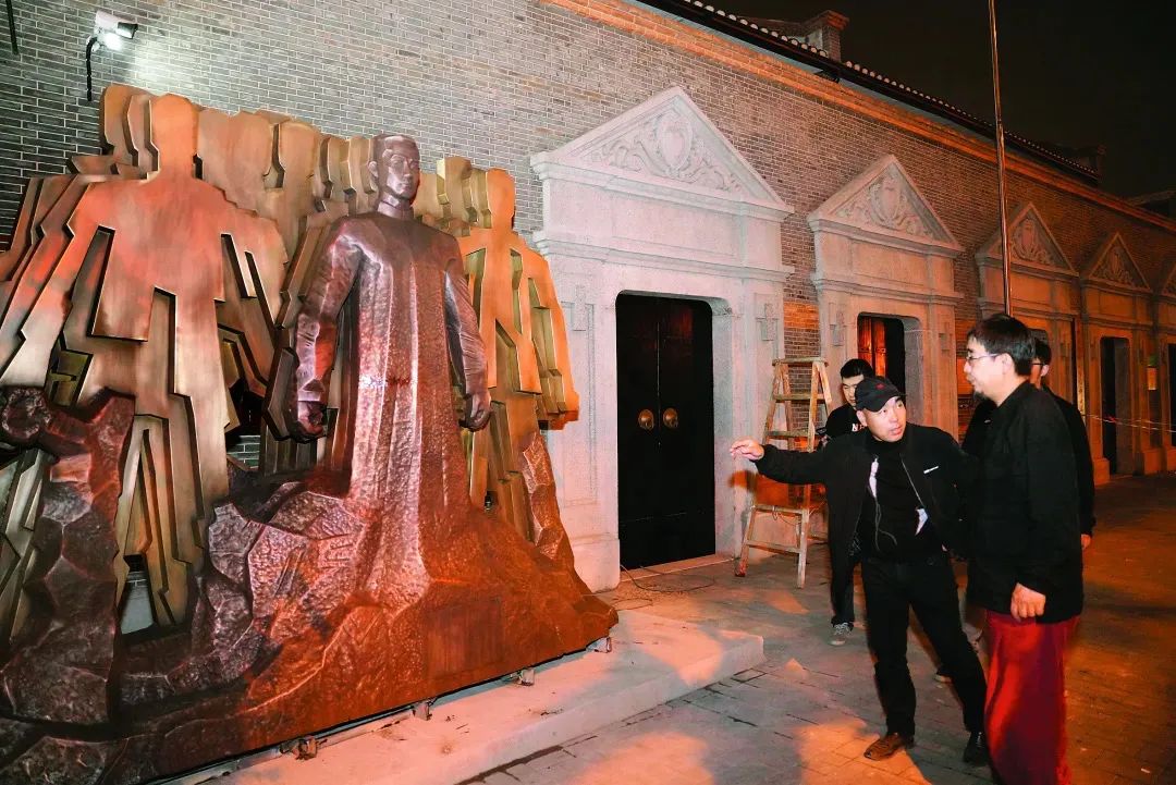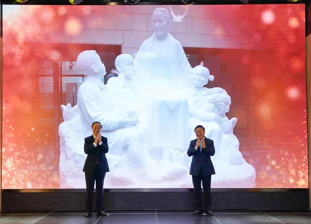 王家瑞和翁祖亮为雕塑《宋奶奶和孩子们》揭幕