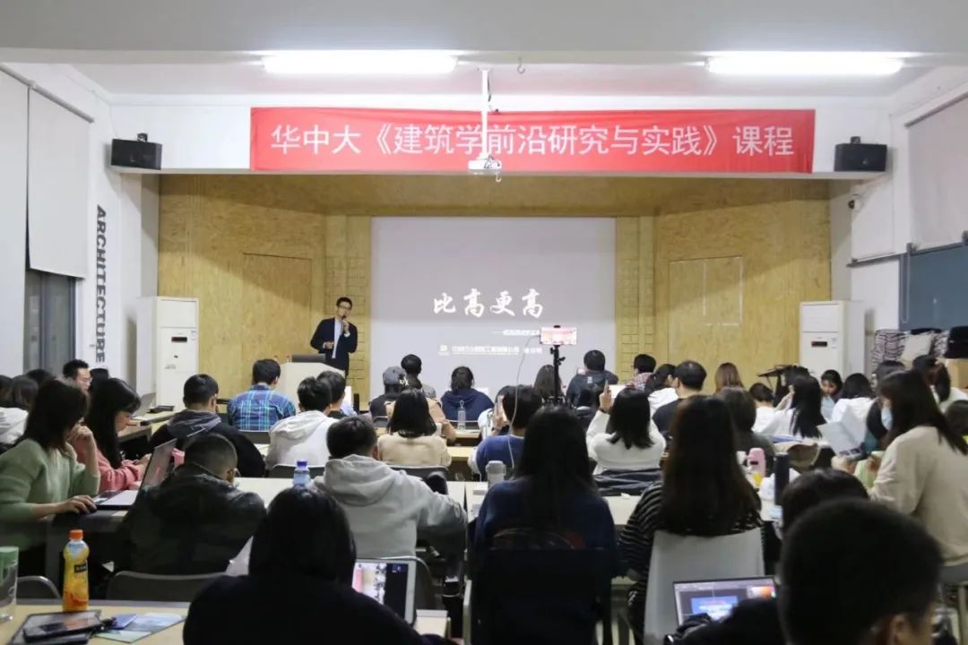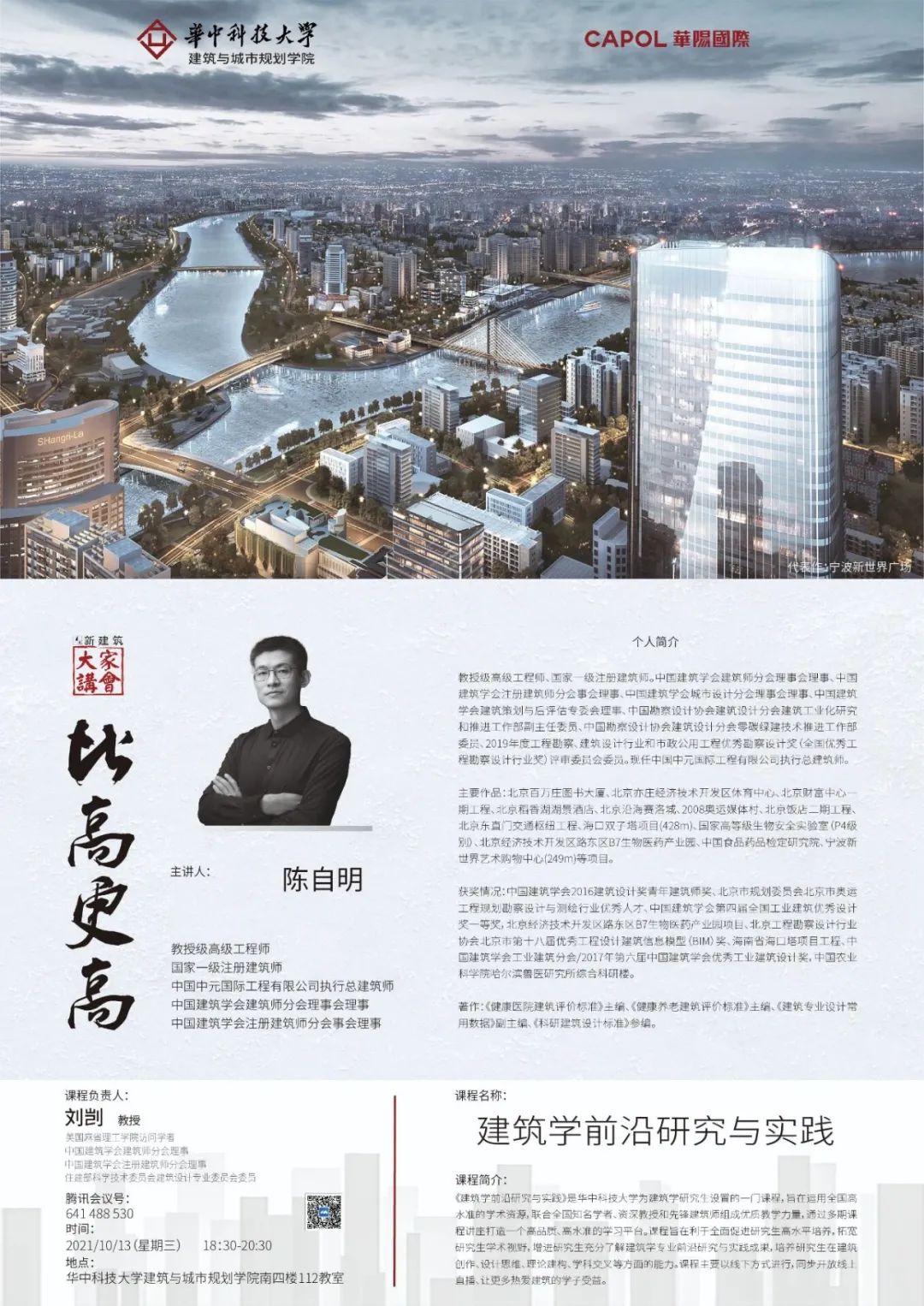 2021年10月13日晚18:30,由华中科技大学建规学院开设的《建筑学前沿研究与实践》研究生课程第三讲正式开始。在课程第三讲中,陈自明建筑师受邀作为主讲人,为大家讲述了以“比高更高”为主题的讲座。出席本次讲座的嘉宾有华阳国际武汉公司副总建筑师柯宇、公建一部设计副总监胡海鸥。在本次课程中,除了线下同学们在现场的认真倾听,同时还收到了全国热爱建筑学专业高校学子的线上热情参与。