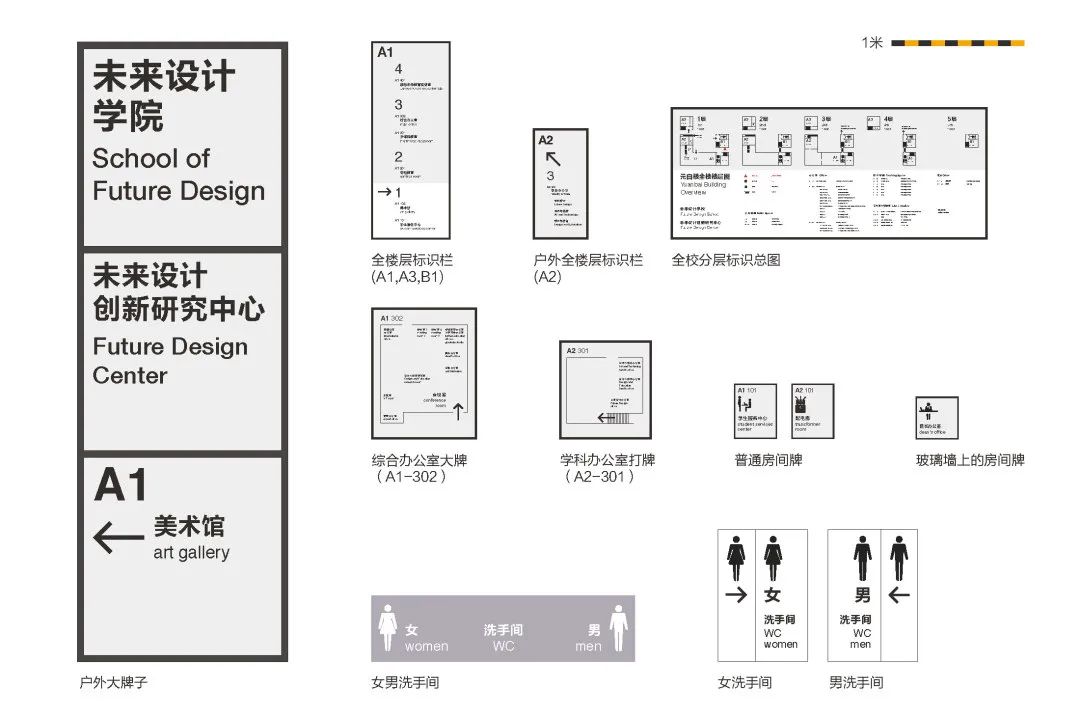 Chris:关于学院楼的标识设计,我的灵感来源于元白楼的黑框窗户,这让我联想到科幻电影,以及挂在墙上的画作。标识作为建筑的一部分,不能破坏建筑的整体感,而画框的设计刚好能很好地避免这一点。对于文字信息的设计,我运用了电子界面设计逻辑,可读性更强,用户体验感更好。