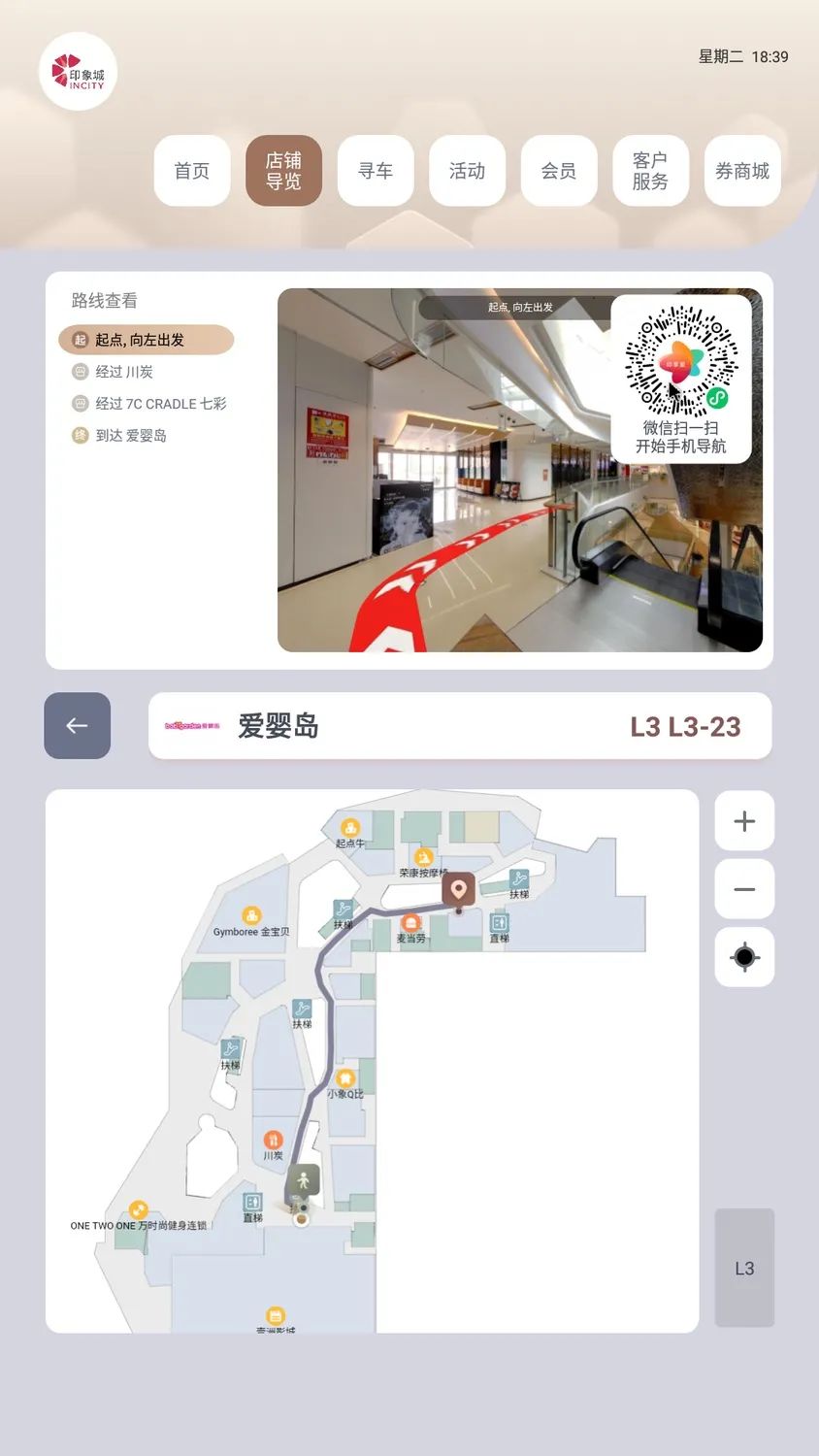 全知全能的「室内3D实景地图」,提供360度VR实景导航、商场实时活动信息获取、断点续航等人性化服务;