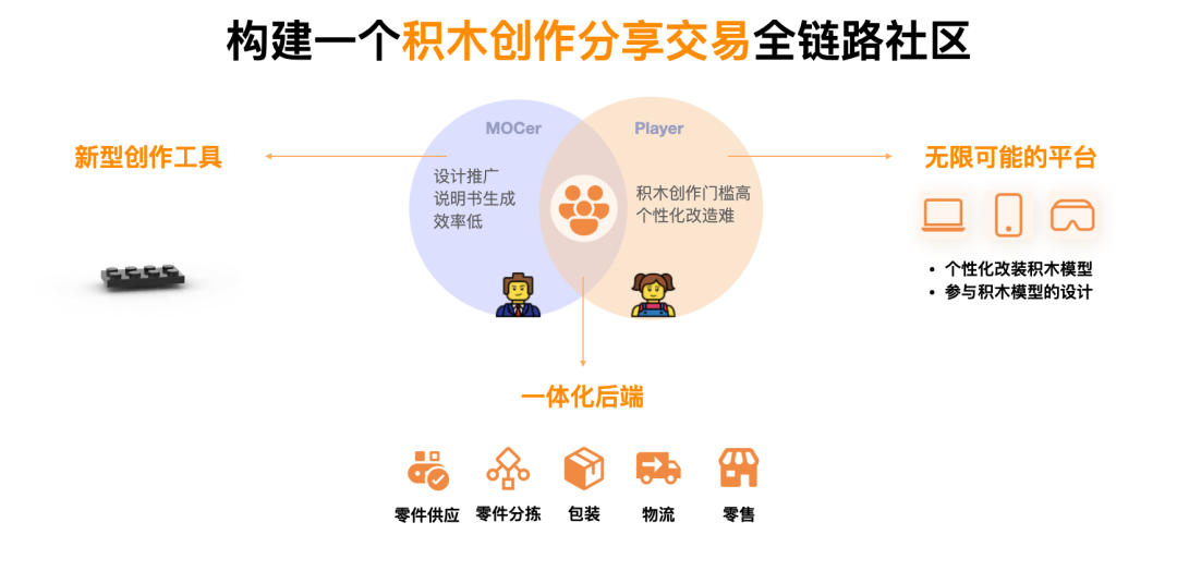 我们将充分利用不同的平台包括PC端,智能手机,虚拟现实,以及我们的增强技术各自的优势,允许用户对积木模型进行个性化改装,甚至亲手创作积木模型。而我们的平台也将整合零件生产商提供包括零件供应与分拣,包装,物流与发售的一体化后端系统,让用户一键下单就可以买到自己心仪的积木模型。