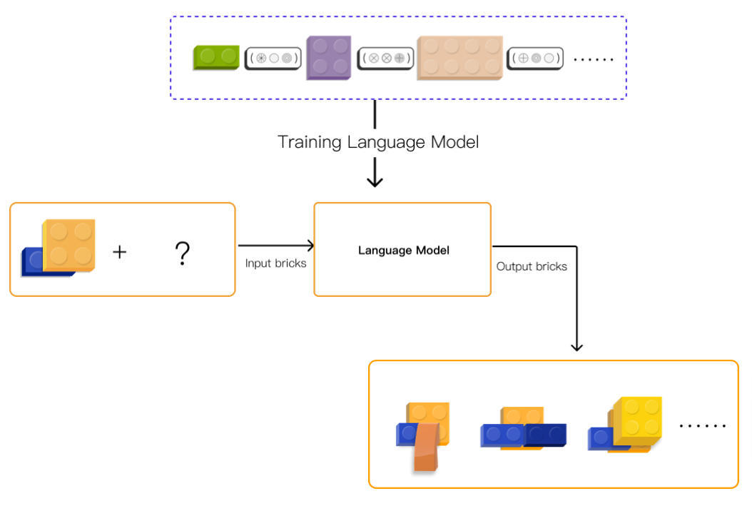 即将积木拼装问题建模成语言模型,把积木块像语言一样调整组合;