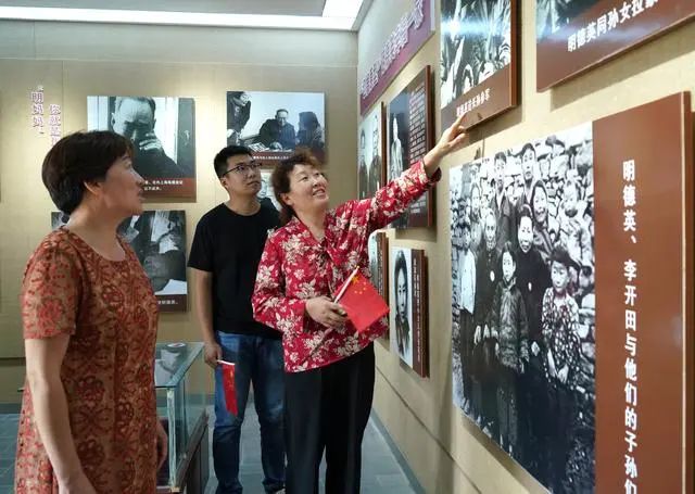 10月2日,沂蒙红嫂明德英的孙媳妇耿胜红(前)、孙女李守英(中)、重孙李超(后)在参观沂蒙红嫂明德英纪念馆。