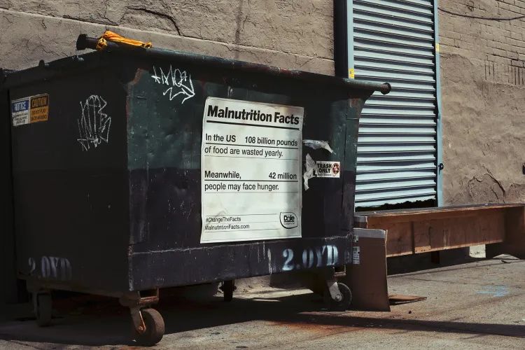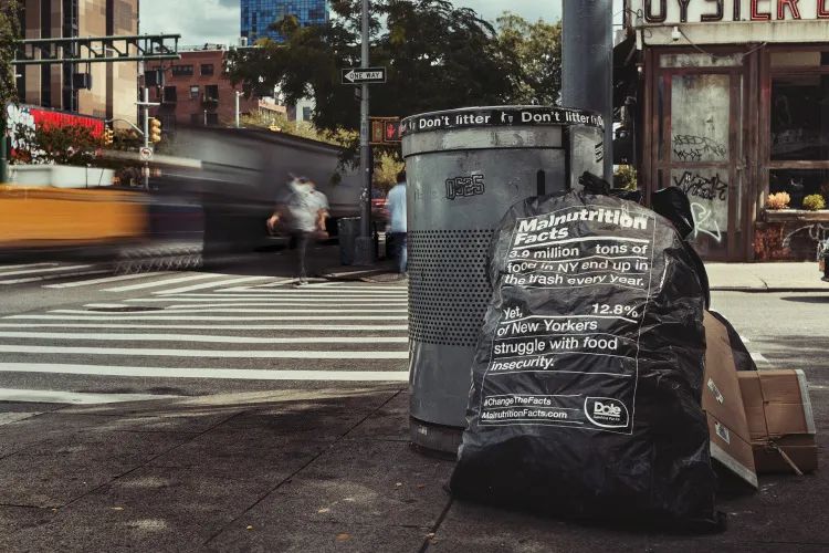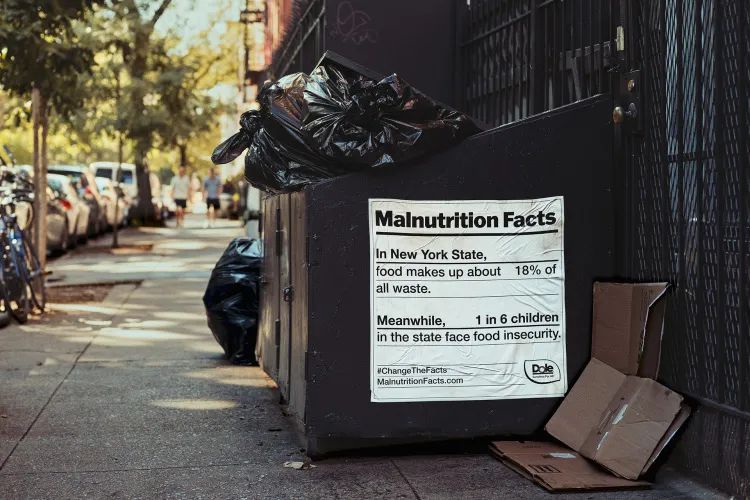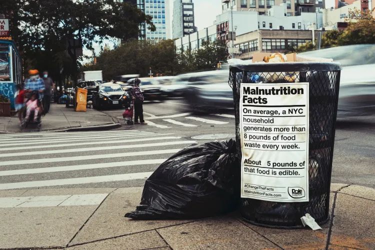 水果品牌都乐(Dole)经调查统计发现美国年均浪费1.4亿吨食物,是食物浪费最严重的国家。于是,都乐在纽约市各处的垃圾箱、垃圾桶、垃圾袋、垃圾车上贴了一种“营养不良标签”(Malnutrition Facts),看起来像是食物包装上的营养标签,但仔细一看,标签所呈现是数据和信息是有关食物浪费和饥饿的严峻事实: