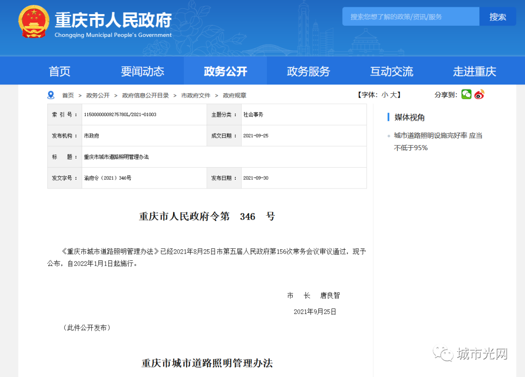 为加强城市道路照明管理,改善城市照明环境,促进能源节约,近日,重庆市政府发布《重庆市城市道路照明管理办法》,并将于2022年1月1日起施行。