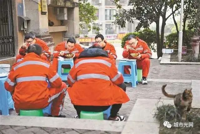 南岸区弹子石,灯饰工人们在街头匆匆用餐,很快又要投入工作