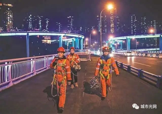 菜园坝大桥,工人们携带着灯饰维修装备准备上桥