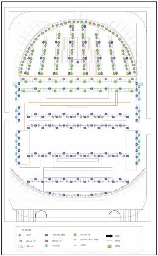 本次晚会节目均采用4K超高清摄像机录制,画面更加清晰,暗部细节更加丰富。为了更好地还原超高清电视画面层次,根据空间的作用以及表演形式,在灯具选择、照度以及布光角度等方面进行反复推敲设计。在面光的选择上,全部采用显色指数90以上的光源,电脑切割灯作为晚会主光源,为保证录制画面一致性,每个表演区域照度在500 lx(±50 lx)且色温为5 200 K(±100 K),光谱在可见光各个波长上的能量相对均匀。作为对表演区的灯光补充,在观众席后方设置4台高显色追光灯作为补充。摄像机光圈设定在4.0左右,在全局布光设计的基础上,主舞台和格子空间分别使用电脑切割灯精确切出光照范围,在格子空间里面使用LED线条灯(washwall),营造色彩氛围。观众席区域,每张圆桌正上方挂一个电脑切割灯,只对圆桌范围进行点光源布光,观众席后区使用LED帕灯进行逆光渲染,并采用电脑切割灯做观众面光,确保每一个单独的空间都有独特的布光效果(图5)。