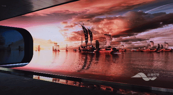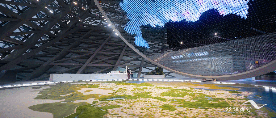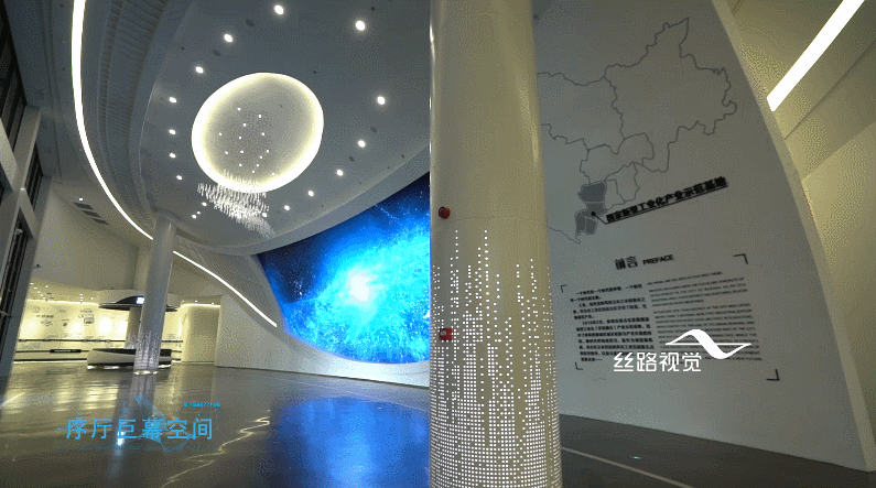 展馆以“蓄势今朝引浪潮”为立意,在设计中加入海洋图腾,呼应主题;将影像与机械组合以塑造仪式感,放大空间尺度,成为延展精神的绝佳载体。观众得以浏览烟台城市经济飞速发展的盛景,瞭望中国(山东)自由贸易试验区烟台片区规划星空的宏大格局。