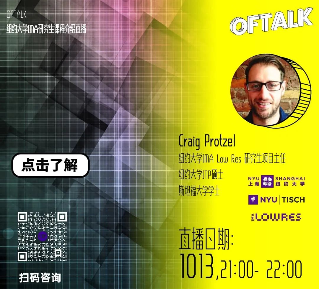 想要突破职业瓶颈,探索艺术与设计的无限可能吗? 马上扫描下方二维码,进群收看直播! 直播嘉宾与Talk主题 想要知道现在最热门的最便利的新媒体创作工具?加入王志鹏老师的TouchDesinger音画互动大师班你就能称为目前最抢手的高薪人才。 在TouchDesinger音画互动大师班直播公开课中你能了解到如何轻松学会用TouchDesigner制作音画互动,去掉繁琐困难的代码,仅靠“连连看”就能做出交互视觉特效! ©️ , 王志鹏 王志鹏 Zhipeng Wang 数字媒介创作人 中国美术学院创新设计学院讲师 申请季已经到来,OF Course 特别邀请来自纽约大学ITP和IMA项目的研究生项目主任Craig Protzel为大家带来互动媒体艺术项目的课程介绍,讲解申请步骤和申请时会遇到的常见问题。 纽约大学和上海纽约大学联合创办的互动媒体艺术(IMA Low Res)项目是一个独特的研究生项目,挑战了高等教育的种种限制。植根于 "边做边学 "的创客文化,IMA Low Res项目为学生提供一个专注于互动媒体艺术的创作、应用和理解的机会,发展学生创造性表达和批判性参与的能力。想要了解如何轻松申请纽约大学,加入直播与研究生项目主任面对面交流! ©️ 克雷教授将携纽约大学项目招生主任美登利,NYU项目运营主管庄瑶瑶,IMA项目学生代表Frost N,为您带来精彩内容 克雷·格普罗策尔 Craig Protzel 纽约大学IMA Low Res研究生项目主任 本期讲座,石伟力将介绍他的个人艺术项目以及在 Bluecadet参与到的博物馆项目。通过具体的案例解析,他讲分享 AI技术分别在艺术创作和博物馆交互体验设计中的应用。他将详细介绍两个案例,《地球照耀火星》系列与亨利福特美国创新博物馆的AI交互桌面。 ©️ 石伟力 石伟力 Weili Shi Bluecadet 多媒体设计师/工程师 帕森斯设计学院设计与科技专业外聘讲师 清华大学计算机科学与技术专业的工学硕士 人工智能近年来在图像识别和生成领域取得了良好发展,逐渐成为艺术和设计的良好助推器。此次主题演讲聚焦人工智能在艺术和设计领域的应用。 首先,周宇乾将与我们一起分享人工智能在图像修复上的应用,比如图像填充(image inpainting),老照片修复,敦煌莫高窟的数字化复原,低光照摄影的色彩增强和去噪等。之后,他会与我们探讨利用人工智能工具进行艺术设计的例子和未来方向,并分享AI+Design课上的课业项目和学生作品,以及部分设计学生的反馈。最后,对于他会分享作为设计师,如何将人工智能模块嵌入产品设计,以更好的满足用户需求,以及拓展对未来世界的想象。 ©️周宇乾 周宇乾 Francis Zhou Adobe Photoshop 研发科学家 美国伊利诺伊香槟分校(UIUC)在读博士 UIUC AI + Design 课程导师 立刻扫描二维码 第一时间观看直播 立即扫码添加客服