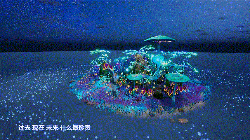 平静的水面上漂浮着一座小岛,白天是一座长满在植物的小岛,蝴蝶在花丛中飞舞,与一般小岛没什么不同。到了夜晚,植物发出奇异的光亮,巨大的蘑菇从地里生长出来,所有的植物在夜间苏醒了过来。