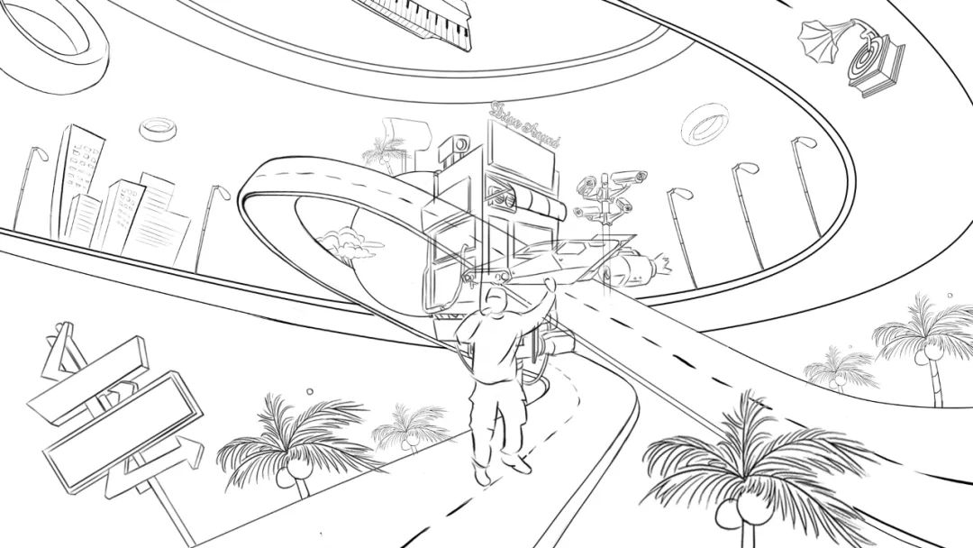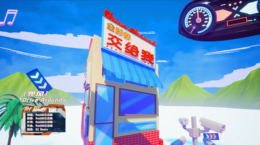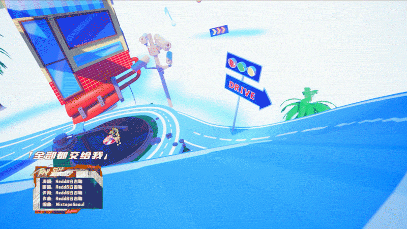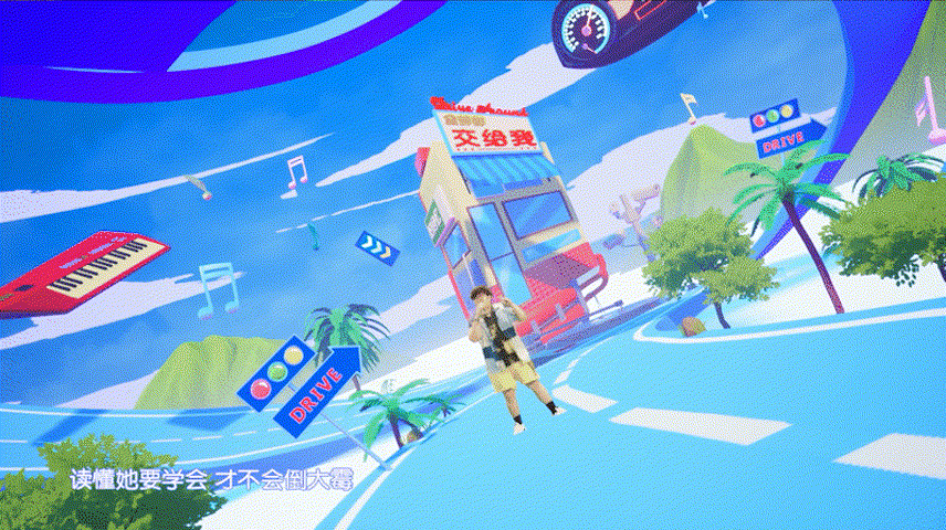 蜿蜒曲折的公路在空中盘旋,搭配色彩鲜明的汽车和棕榈树,营造出假日氛围。歌手在演唱时漂浮在空中的仪表盘和音符,增加了趣味性,使整个表演更加生动真实。