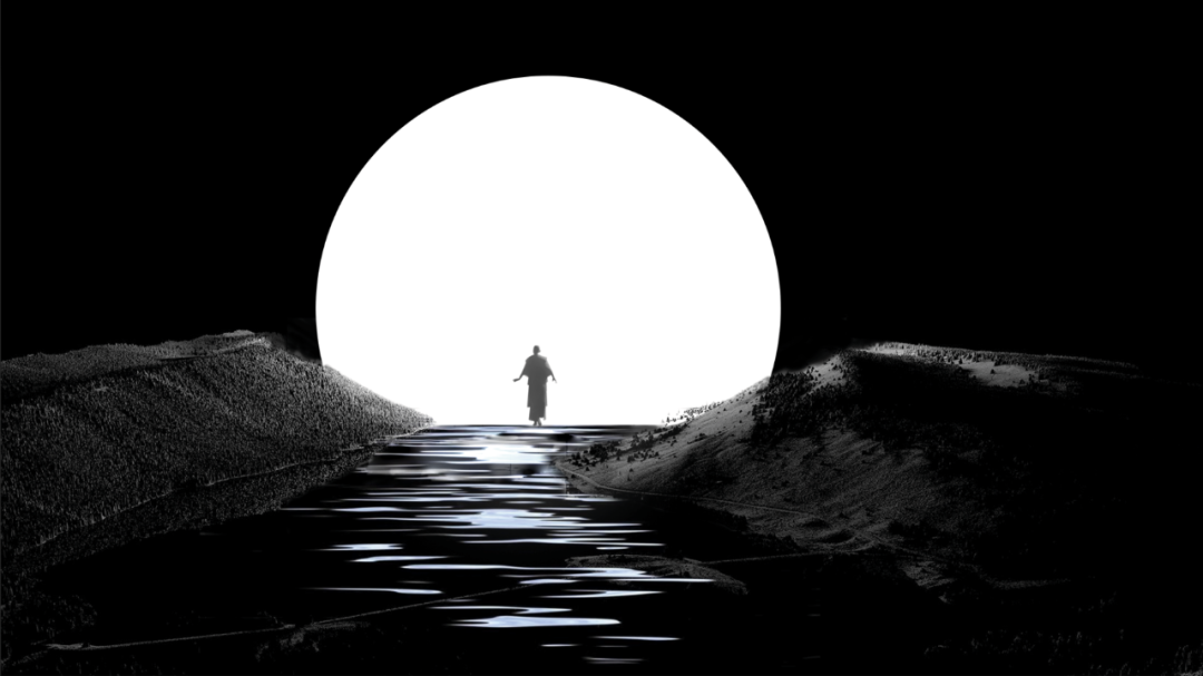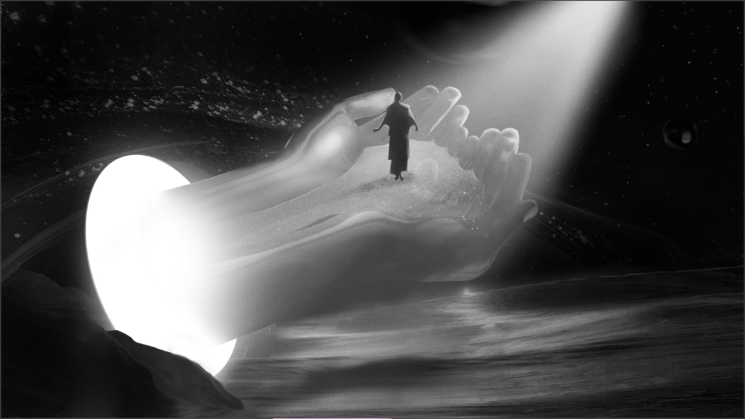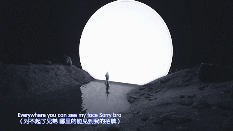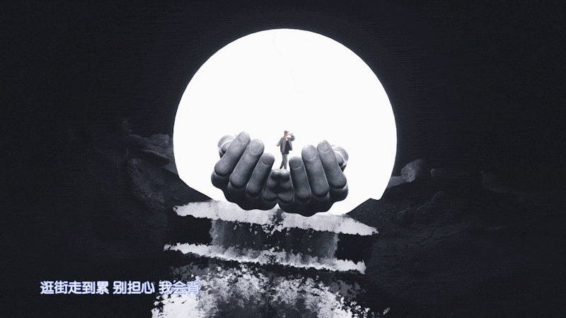 黑白灰的色彩凸出画面的质感,这是一个意象化场景。山水间有一轮巨大的明月,与歌者的渺小形成对比,营造出巨大的空间感。第二首歌开始,歌者转身走进月亮里,随后从月亮中伸出一双巨大的手,歌者站在手捧着的银河里演唱,整个场景虚幻又真实。