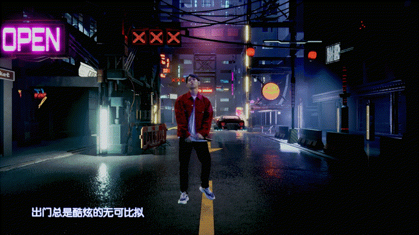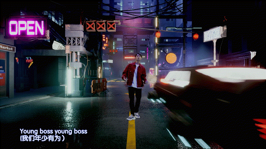 赛博朋克风的街头场景,满满的未来科技感,行驶的飞船,低空飞行的汽车,将观众代入其中。演唱者拳头挥出,玻璃应声破碎,四处飞散,带给观众真实感。