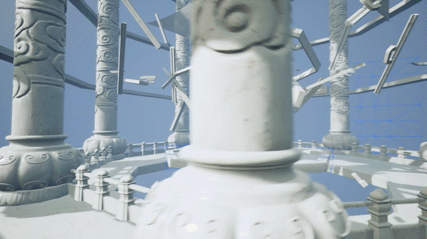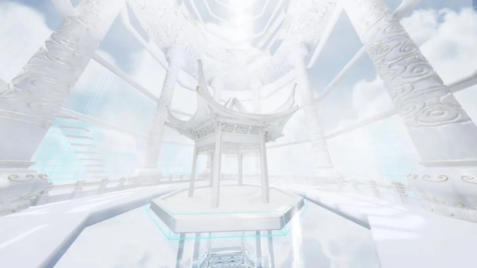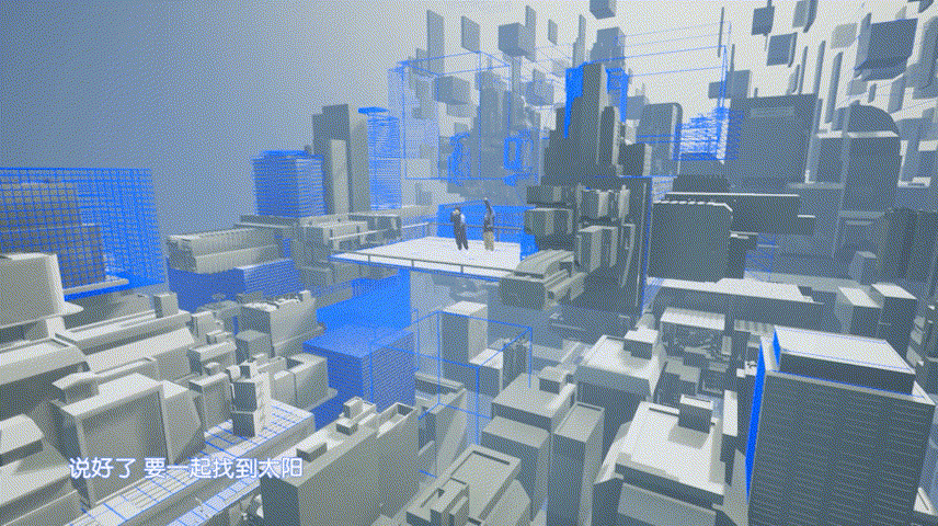 这是现代城市与古代建筑并存的空间,在演唱过程中一条巨龙盘旋而上,冲破了像牢笼般的亭子,来到了现代城市。