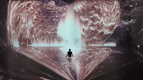 通过数字算法生成3D数字雕塑,三个投影墙为30mx10m,地面投影为30mx30m,将12个视频投影仪融合在一起,以覆盖整个投影空间。