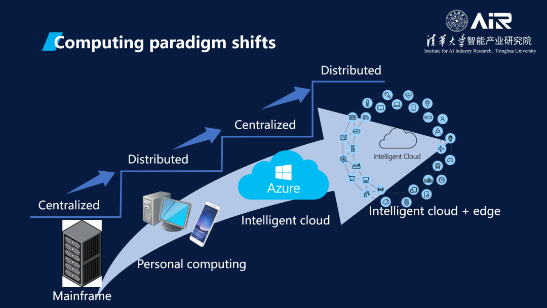 在大型机(Mainframe)时代,计算资源稀缺,很多人共享一台主机,计算是集中式的;随着集成电路和晶体管的发展,计算机逐渐从昂贵的“大块头”缩小成价格低廉,人人都能购买得到的台式机和便于携带的笔记本电脑,人类进入了个人计算(Personal Computing)时代,计算又成为分布式的。在云计算时代,计算模式又回到集中式的,通过高速网络,人们可以共享云上的海量的计算和存储资源。此时,人工智能(AI)蓬勃发展,云上提供很多智能服务,成为智能云计算。而随着边缘计算的出现,计算模式再一次成为分布式的。我们不仅有智能云计算,还要有智能边缘计算(Intelligent Edge Computing)。