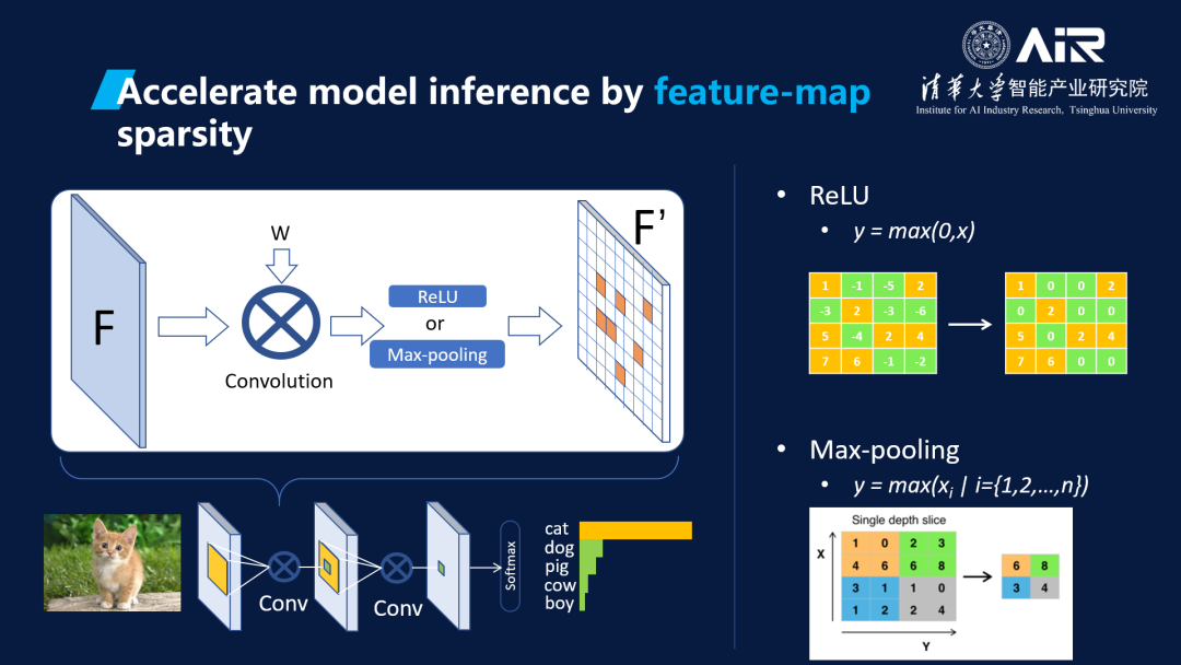 模型中间结果(feature-map)的稀疏工作发表论文“SeerNet: Predicting Convolutional Neural Network Feature-Map Sparsity through Low-Bit Quantization”,被CVPR 2019录用。该工作提出了一种利用特征映射稀缺性来加速CNN推断的新的通用方法。实验证明原始网络高度量化的版本足够准确地预测输出稀缺性,且利用这种在推断时的稀缺性会导致与原网络相比必不可少的准确率下降。为了加速推断,对每个卷积层,该方法首先通过在原始网络层的量化版本上运行推断来获得一个输出特征映射的二元稀疏掩码,随后进行一个全精度稀缺卷积来找到非零输出的精确值。