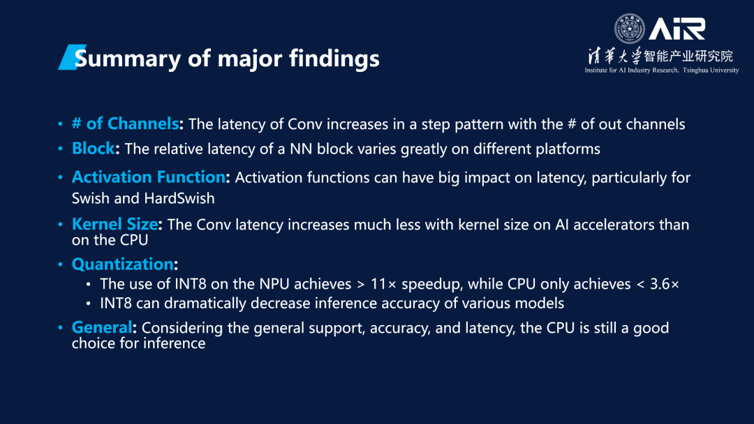 深入研究不同的模型结构在不同的硬件平台上运行时的行为特性,我们在7种硬件平台上,包括ARM CPU、Adreno GPU、DSP、VPU、Edge TPU、Kendryte KPU和Rockchip NPU,对神经网络模型设计的不同维度(比如不同类型的算子、卷积的通道数、不同的激活函数、数据的精度等)进行了深度评估,发现总结了多种异常的行为特征(比如,增加卷积的通道数并不一定增加执行时间),并揭示了其背后的原因和对于改进神经网络设计的启示。这些发现充分表明,我们在设计神经网络模型时就要充分考虑硬件的差异性,为不同的硬件设计不同的模型,以在模型执行延迟和模型精度之间取得最佳的平衡。