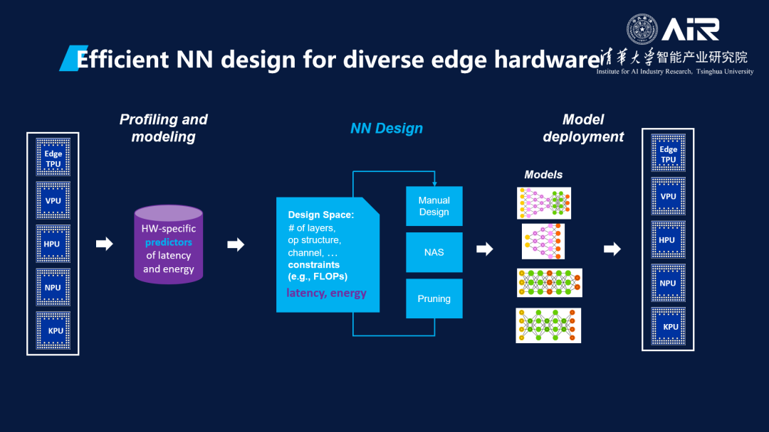 面向不同设备的模型压缩和优化。深度学习模型通常都十分庞大,由数百万甚至以亿计的参数构成。运行这些模型需要耗费大量的计算和内存资源。虽然智能边缘设备的处理和存储能力大幅增长,和云计算相比还是远远不如。因此,如何把深度学习模型在资源受限的边缘设备上运行起来就是一个巨大的挑战。传统的模型压缩和优化(比如剪枝,量化等)主要关注的是如何把模型变小的同时尽量少损失模型精度。然而,边缘设备的特点是类型多,差异性大,处理器类型性能和内存大小千差万别。我们认为,没有一个统一的模型能够适用于所有的边缘设备,而是应该结合硬件的特性,为不同的设备提供最适合的模型,不仅考虑模型大小和精度损失,更要考虑模型在设备上的执行性能,比如延迟和功耗等。