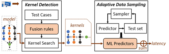 nn-Meter的关键思想是将整个模型划分为内核(kernel),即硬件设备上的执行单元,然后执行内核级预测。如图3所示,nn-Meter建立在两个关键技术之上:内核检测(Kernel Detection)和自适应数据采样(Adaptive Data Sampling)。内核检测能够自动识别部署平台(硬件及其软件框架)的算子融合行为,从而基于这些策略将模型分解为实际运行的内核。自适应数据采样从整个设计空间中有效地采样最有益的配置,以高效地构建准确的内核级延迟预测器。对于每个内核,nn-Meter 都会提取特征并预测其延迟,所有内核预测延迟之和则为整个模型的预测延迟。