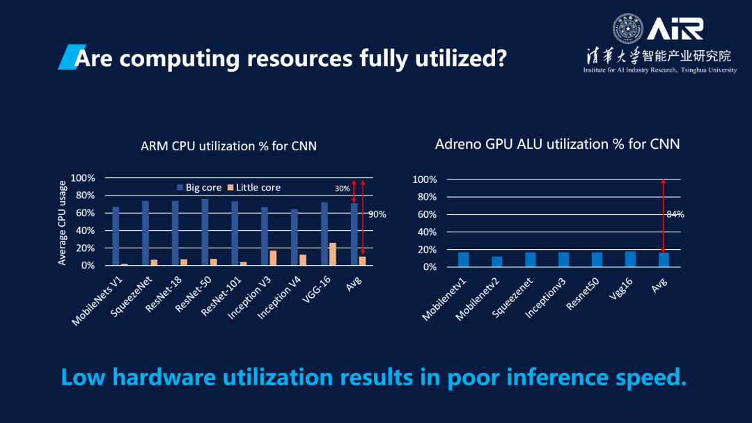 深度学习模型已被大量使用于各类终端应用中。业界不少企业也都推出了端侧推理框架。然而,端侧硬件资源的有限性和异构性以及对低能耗的要求,给高效的模型推理实现带来了更大的挑战。通过测试,我们发现深度学习模型运行在终端设备上时,其计算资源利用率极低。