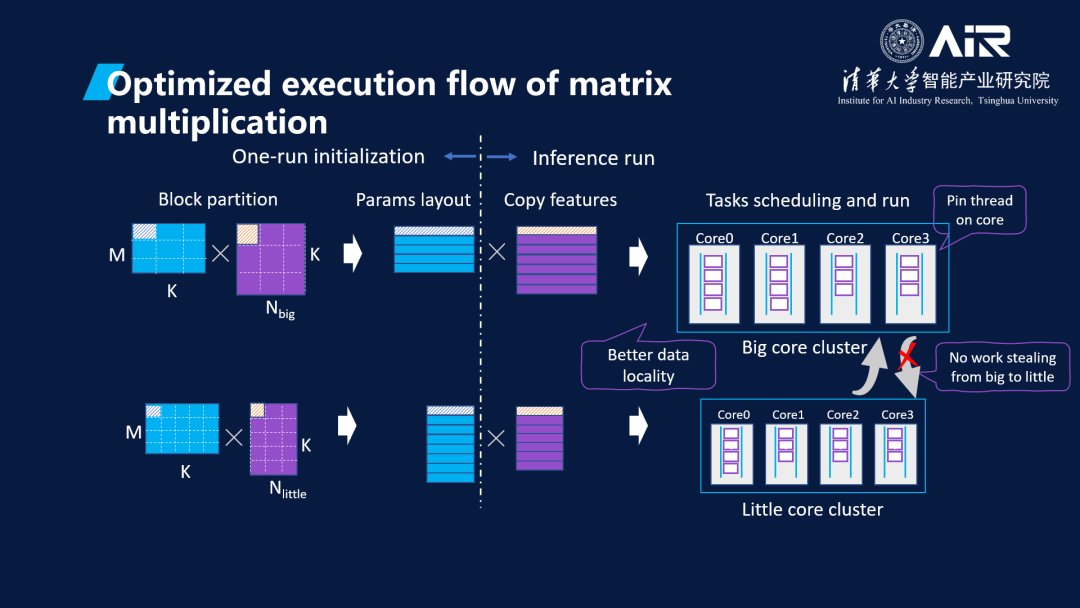 CPU 是移动端侧最主要的计算资源,目前端侧大部分模型推理也都在 CPU 完成。端侧 CPU 多采用大小核的异构多核架构,以同时满足低能耗和高性能的需求。但当增加小核硬件资源时,现有的模型推理实现并不能取得相应的性能加速,而且还浪费了宝贵的硬件资源。通过分析发现该问题是由于推理运行时各个核上不均衡的任务分配所导致。因此,我们提出了AsyMo 解决方案,通过高效利用端侧异构多核 CPU 来加速模型推理的工作。AsyMo 充分考虑了端侧 CPU 的异构性、缓存资源的有限性和执行环境的不确定性,结合推理执行的确定性、算子的易并行性和计算/访存的密集性,实现了基于延迟开销模型的任务划分策略、面向异构的任务调度策略和最优能耗频率设置策略三个关键技术。该工作已发布论文“AsyMo: Scalable and Efficient Deep-Learning Inference on Asymmetric Mobile CPUs”,被MobiCom 2021录用。