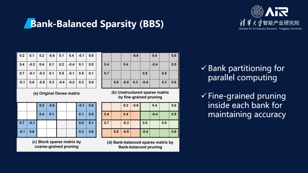 在这之前常用的剪枝方法有细粒度剪枝和粗粒度剪枝。其中,细粒度剪枝会得到一个非结构化的稀疏矩阵(也就是0的分布是不均匀的),将其实施到硬件上时会有负载不均衡的问题;粗粒度剪枝可以得到结构化的稀疏矩阵,但是对精度的影响会比较大。而我们提出的Bank-Balanced剪枝兼顾了负载的均衡性与精度,将矩阵的每一行均匀分成N个Bank,然后对每个Bank进行相同稀疏度的细粒度剪枝。