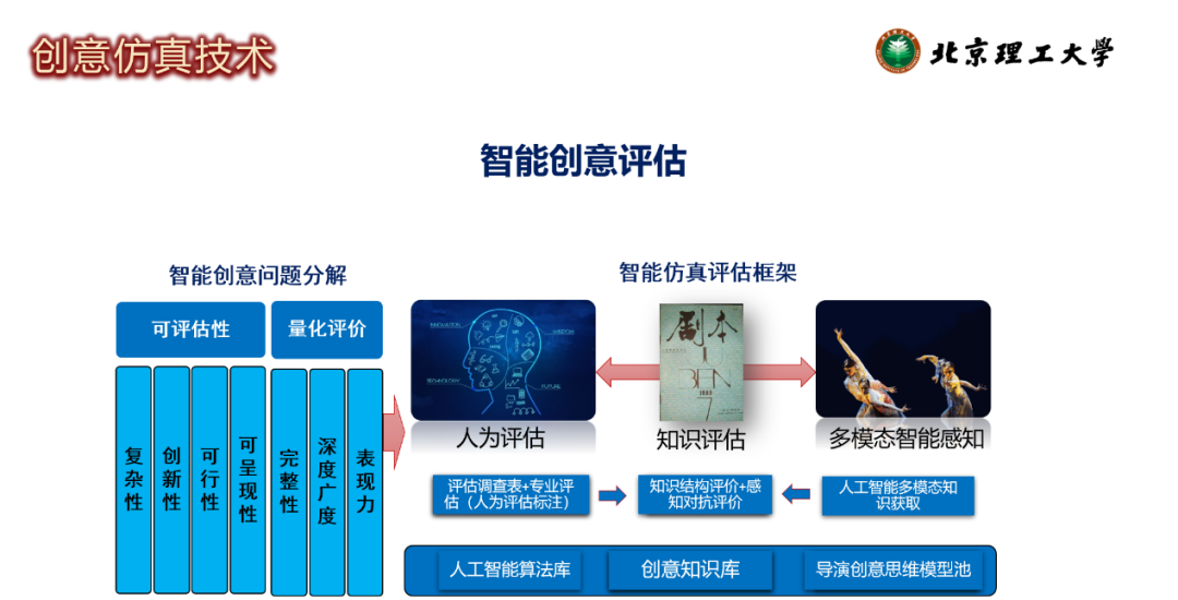 智能媒体与创意,依托人工智能、大数据、云计算、智能仿真等新技术手段,算法不用研制,数据集很丰富。比如影视中大量场景,无论是拍摄手法、光照模型,还是机位和演出的视频里面出现的矛盾,都可以用算法很简单提炼出来,为团队提供创意。利用智能手段来增强实现艺术创意,也能使传统表演艺术演变出新的形式,靠人的大脑去想是一个途径,算法协助计算出十个选项,选两个去试,这种方式使创作如虎添翼。更大的需求在于研究智能媒体、全媒体情况下,媒体与意识之间的演化规律,包括数字化理论、创意方法,以及创意的生成和评估——如何生成,生成之后如何分类,分类出来以后怎么评估,评估以后怎么实现……这一系列的相关工作,研究的整个内涵在于从艺术性、技术性,直到社会价值生成一个闭环。