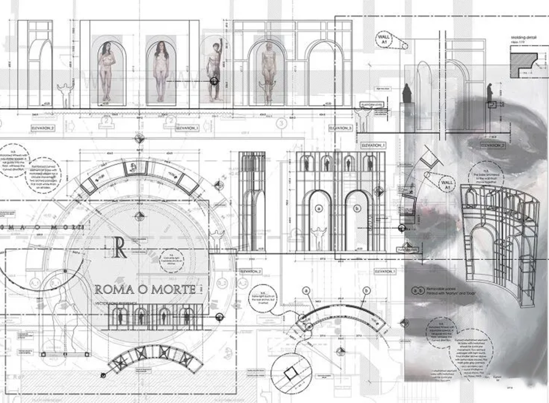 整体设计突出了拱形结构固有的实体和空隙的交替。Emanuele Sinisi(伊曼纽尔·西尼西亚)想把它带到极致-----剥去最里面弯曲的墙壁,只留下铁迹,与最外面的墙壁形成强烈的对比。这些似乎保留着质量和力量,但一旦他们向观众方向移动和前进,人们就意识到它们是空的和不稳定的,隐藏着腐败和邪恶。这对设计师来说是对福音记忆的道德和教义完整性的视觉翻译。