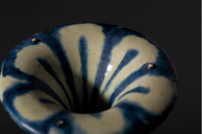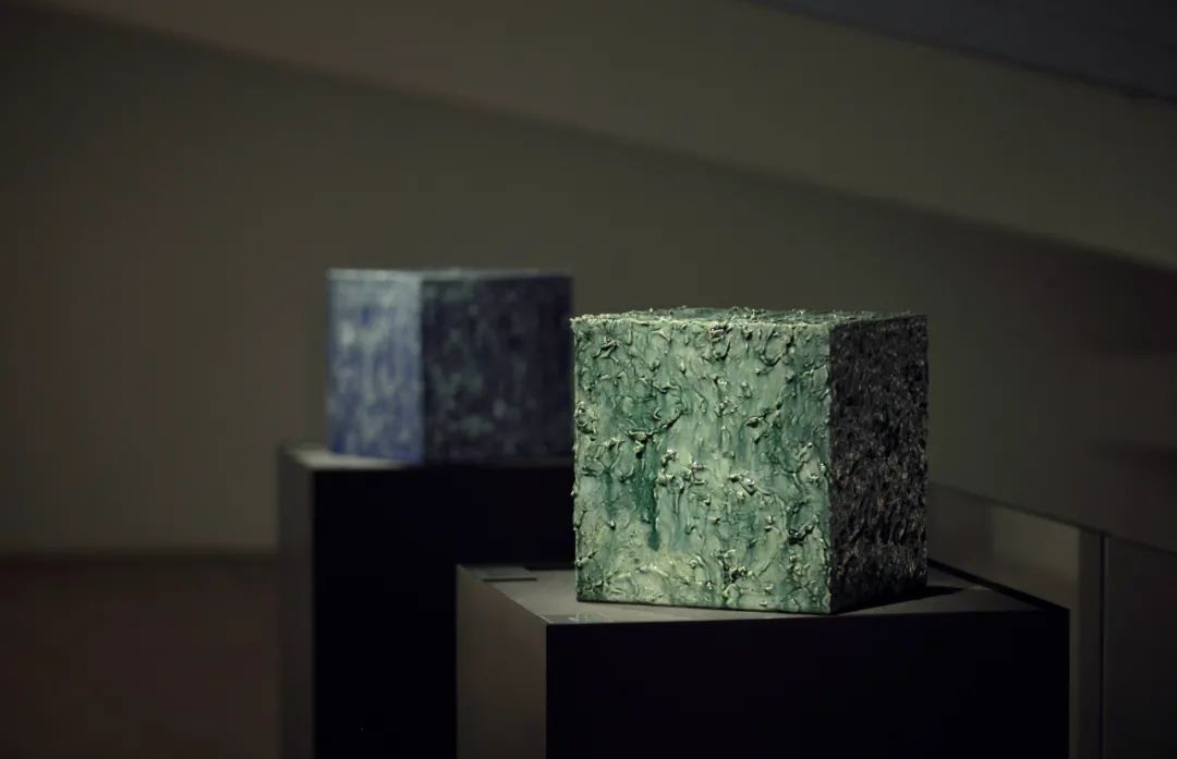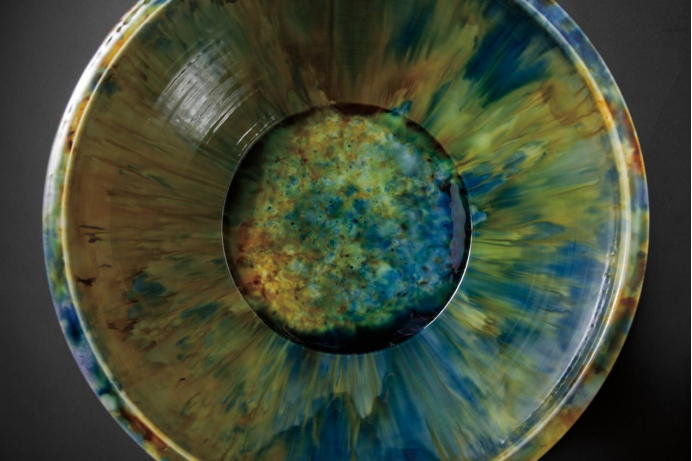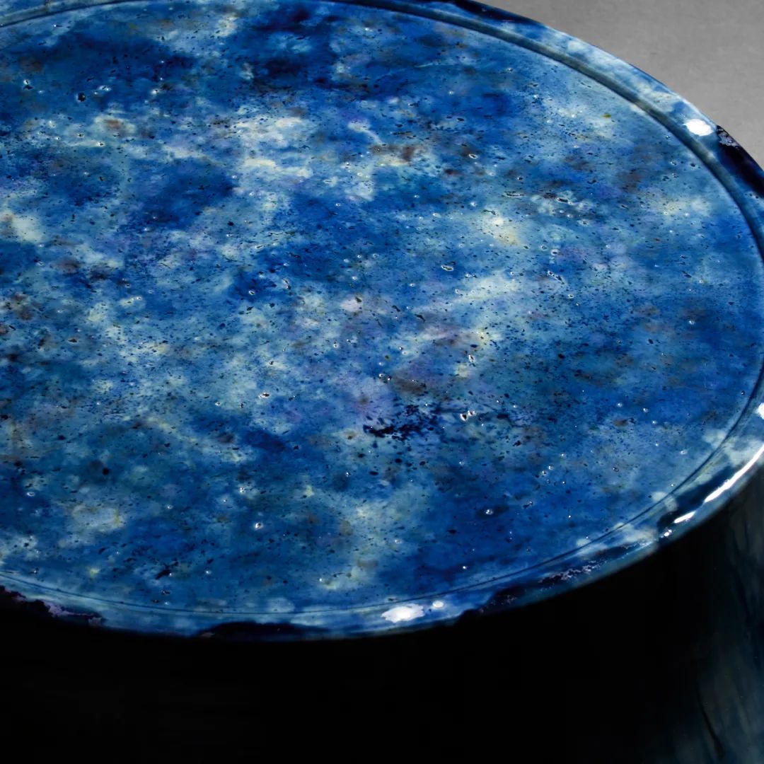 此件作品,真是想象之宙宇的底色,深远、辽阔之蓝,即使是作者本人,最终烧就,看到此般颜色时,仍是被它的美所惊讶,而其通体施以满釉,蓝釉中天然的杂质,金属颗粒在烧制时带来的天然机理,将其深邃意象,用材料语言,表达而出,宙蓝,正是跨越时间,仍能呈现的艺术态势。