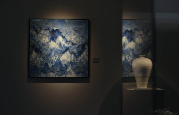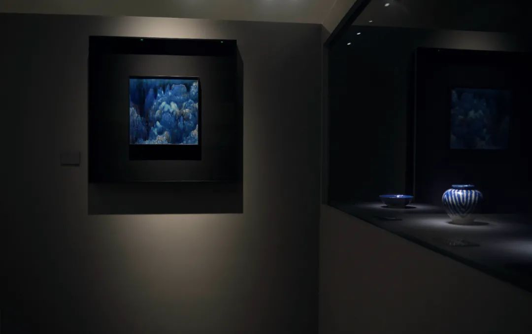三彩的长廊尽头,是钴蓝的挥洒意象——云涌青嶂,白釉、蓝彩层峦相叠,如同登云之阶,随着空间的递进,拾阶而上。