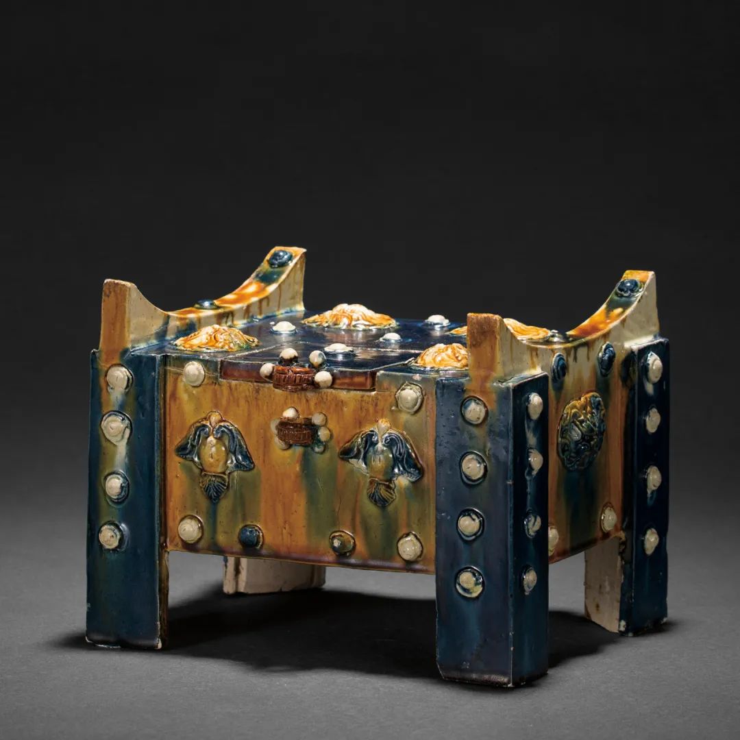 此件三彩钱柜,为三彩釉陶仿作之冥器,在盛唐时期代极为流行,钱柜作四宽足,成极为罕见的三角形柜足,锁环左右两侧,对称贴塑宝瓶纹样花饰,钱柜之柜后、柜盖、柜侧,分别贴塑七个兽面纹,通体饰对称贴饰泡钉纹,兽面、泡钉以及锁环装置应该是仿制木钱柜上的铁、铜金属配件的样式,此柜施黄,蓝,白三色彩釉,蓝釉局部流动与黄釉交融形成绿色,华丽无比,从目前已知同类器物的尺寸比较,此尊钱柜或为其中宽度最大者,殊为珍贵。